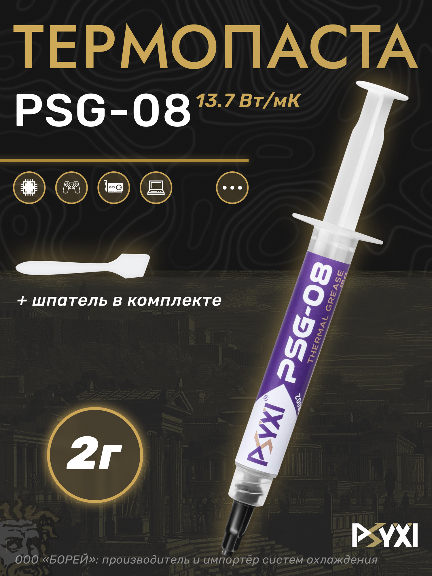 Термопаста PSYXI PSG-08: 13.7 Вт/мК; 2 грамма + шпатель в комплекте интересное: