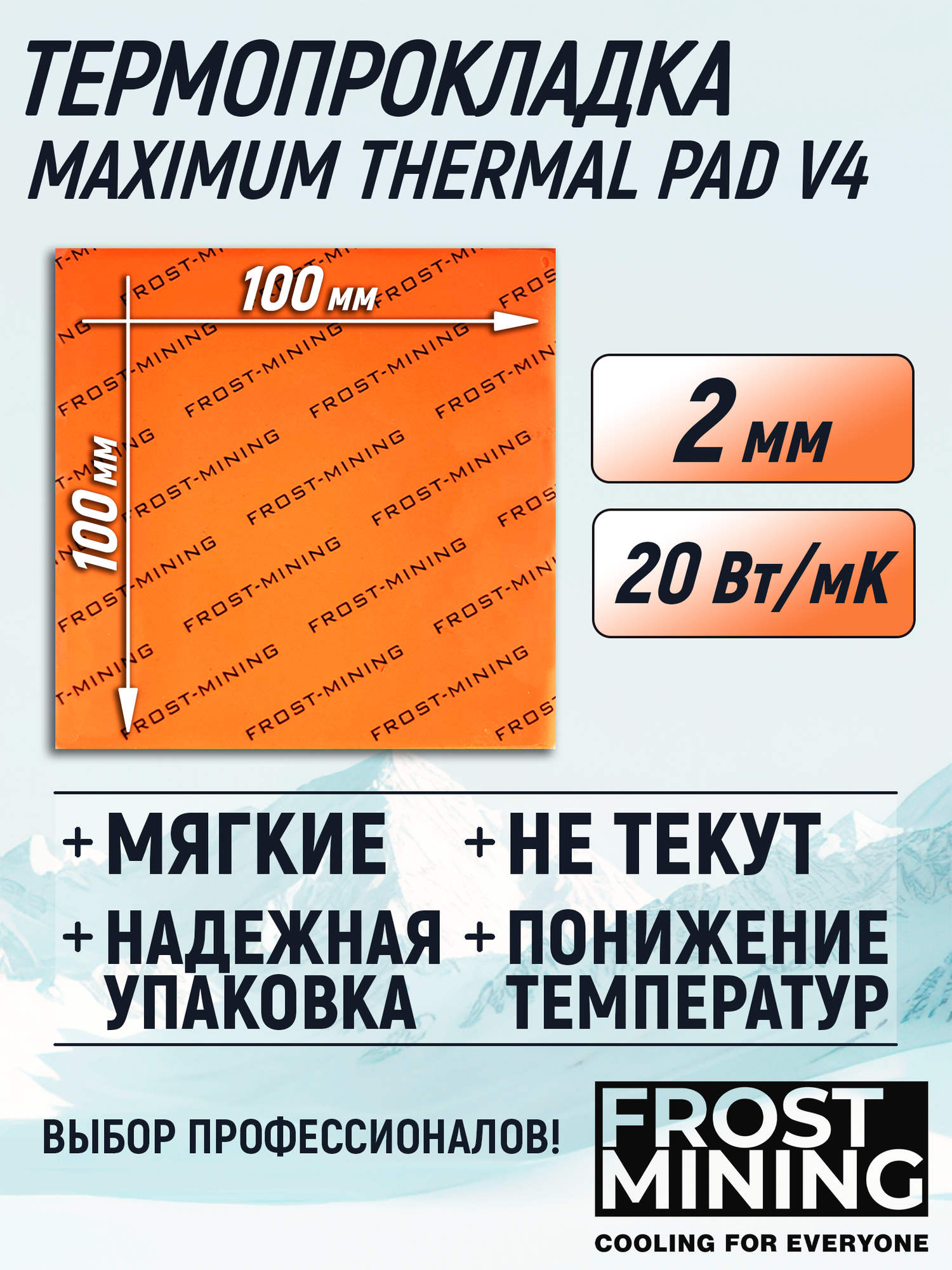Термопрокладка 2.5 мм 20 Вт/мК 100*100 мм для видеокарты, ноутбука, консоли, компьютера, ссд, асика FrostMining Maximum Thermal Pads