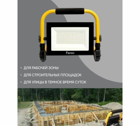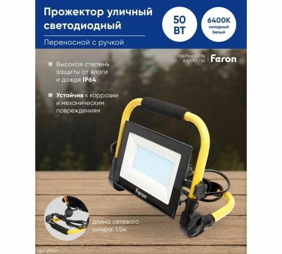 Прожектор светодиодный ДО-50w переносной 6400K 4000Лм IP65 | код 29747 | FERON (1 шт.)