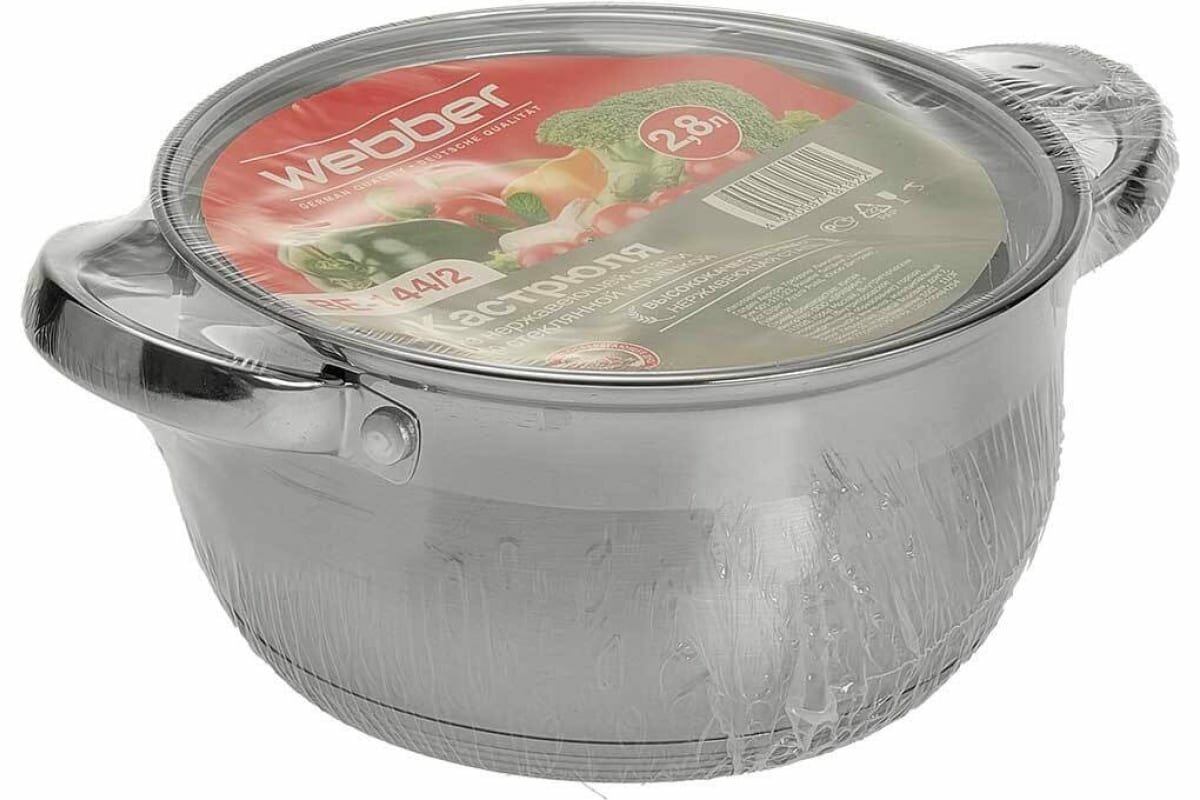 Кастрюля из нержавеющей стали Webber / Вебер BE-144/2 со стеклянной крышкой серебристая 2.8л / посуда для всех видов плит