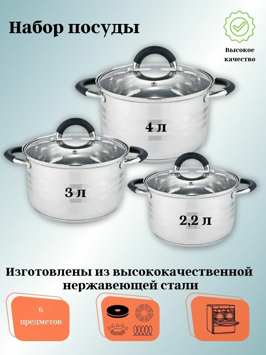 Набор кастрюль Webber, BE-624/6 , 2,2л, 3,0л,4,0л, нерж.сталь, для всех типов плит