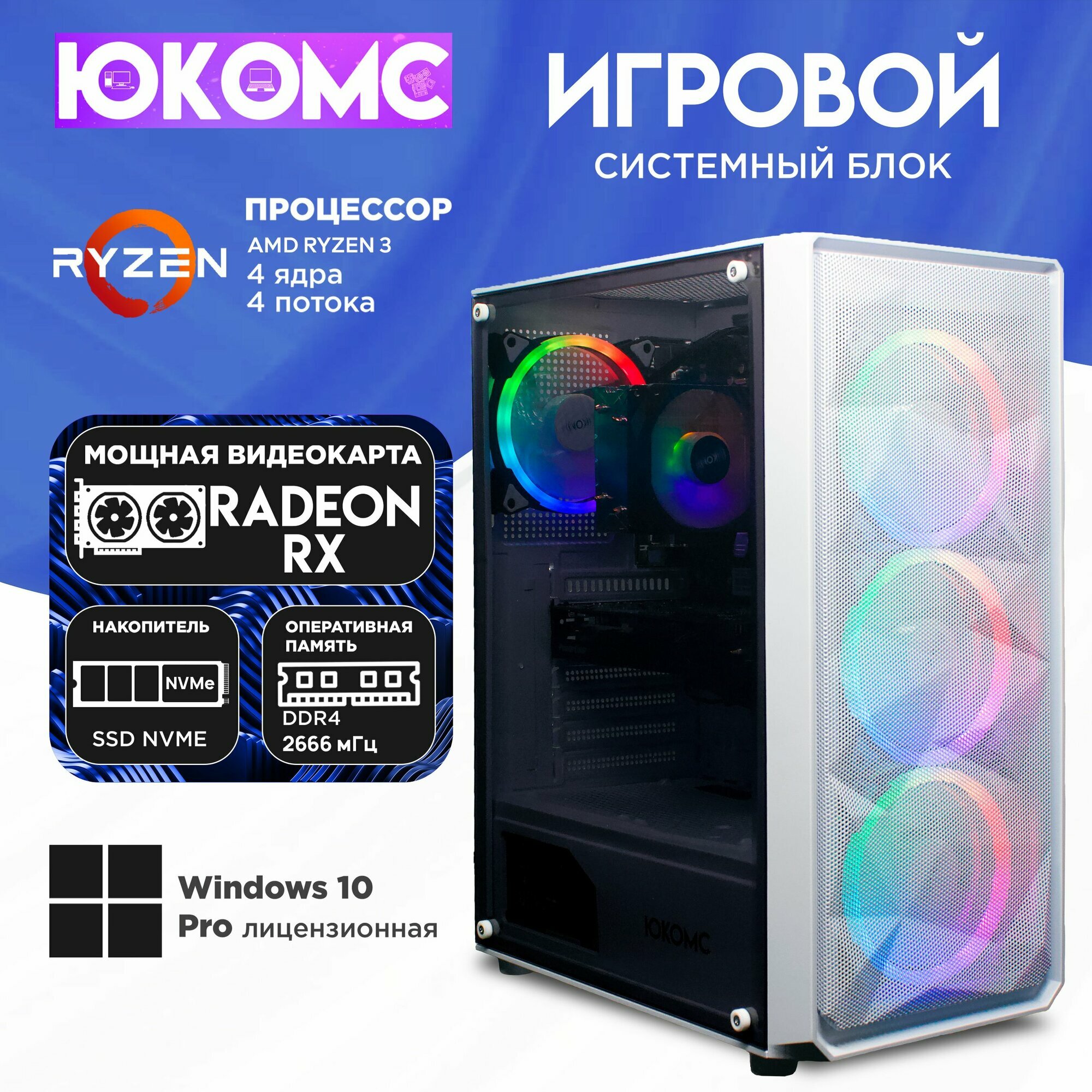 Игровой компьютер юкомс Ryzen 5 1400, RX 570 8GB, SSD 256GB, 16GB DDR4, БП TT450 450W, win 10 pro, Игровой юкомс белый