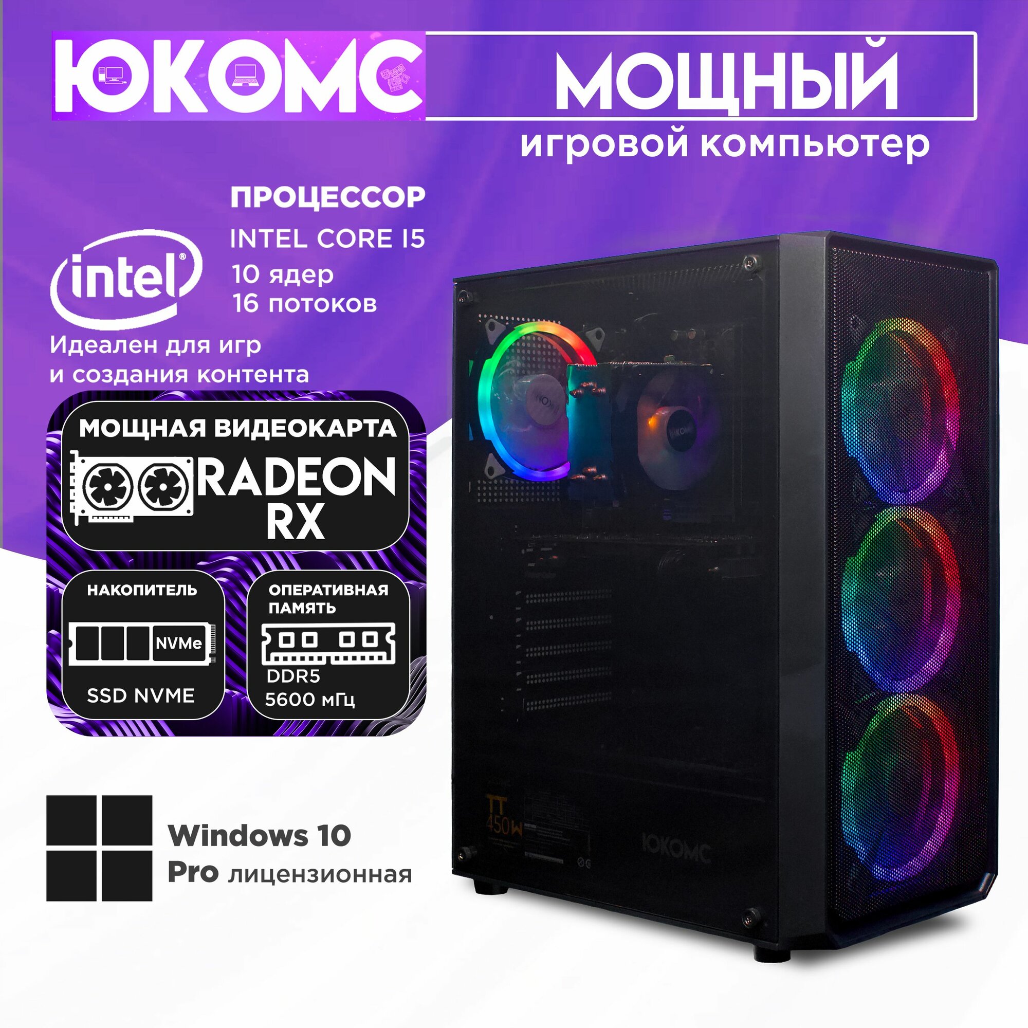 Игровой компьютер юкомс i5 14400F, RX 5600 XT 6GB, SSD 512GB, 16GB DDR5, БП TT450 450W, win 10 pro, Игровой юкомс чёрный