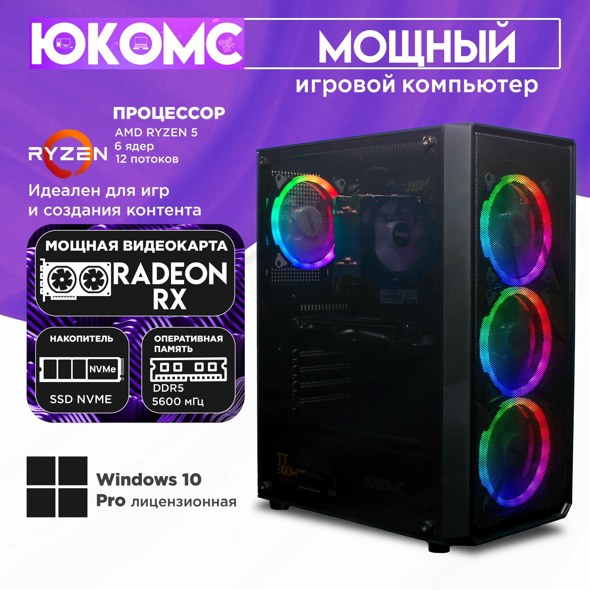 Игровой компьютер юкомс Ryzen 5 5600X, RX 5600 XT 6GB, HDD 1TB, SSD 512GB, 16GB DDR4, БП TT450 450W, win 10 pro, Игровой юкомс чёрный