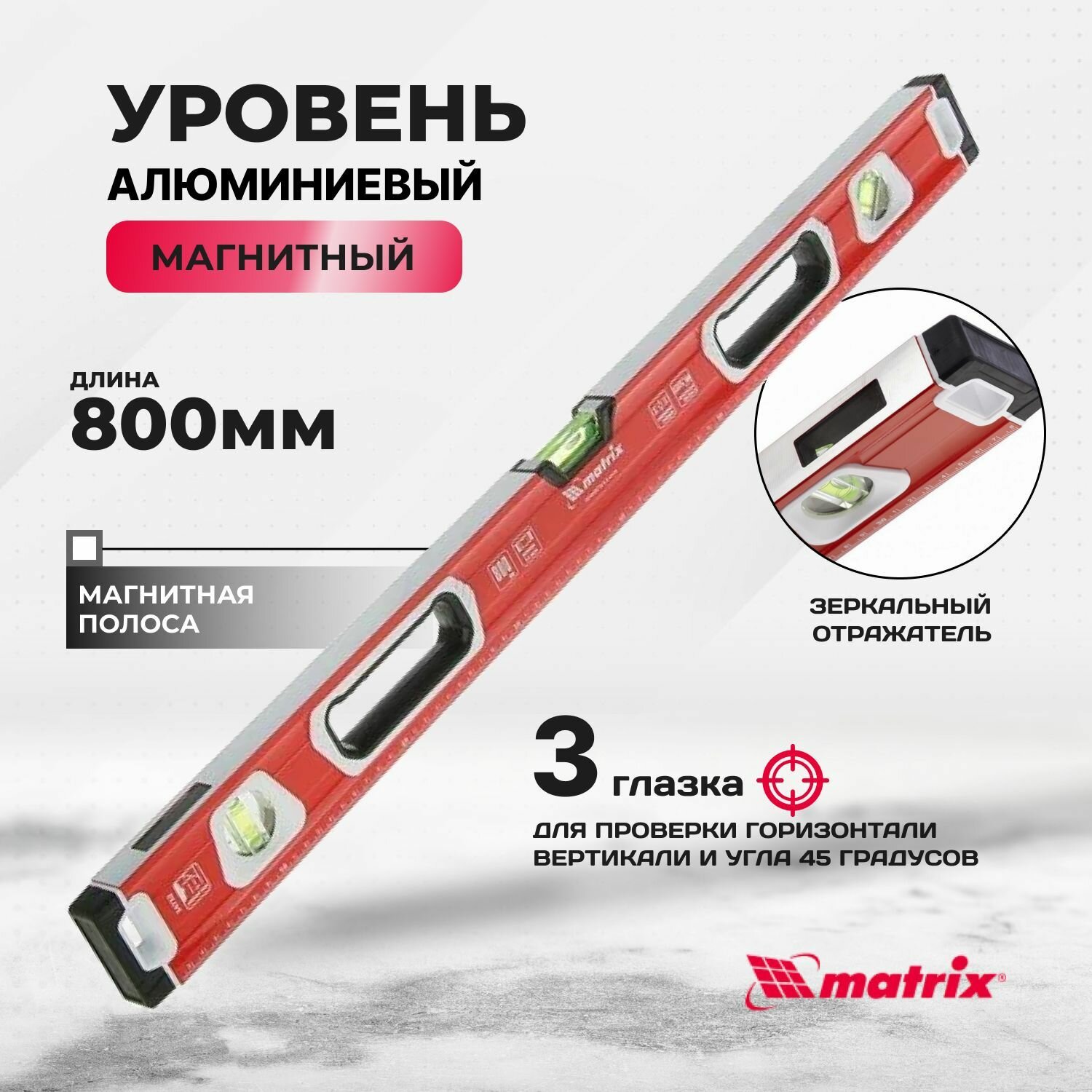 Уровень алюминиевый, магнит, фрезерованный, 3 глазка (1 зеркальный), двухкомпонентные рукоятки, 800 мм Matrix MATRIX