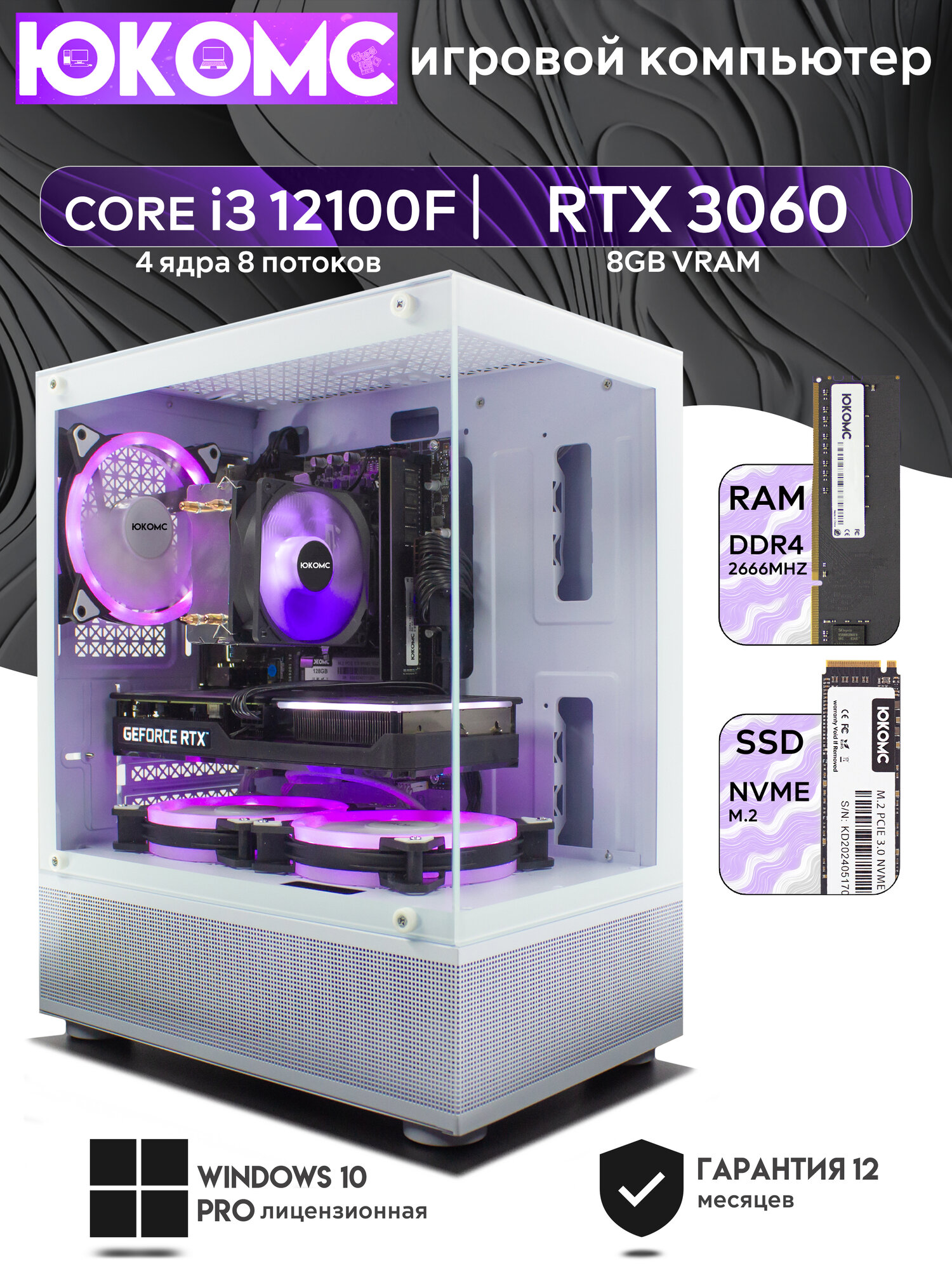 Игровой компьютер юкомс i3 12100F, RTX 3060 8GB, SSD 512GB, 32GB DDR4, БП TT600 600W, win 10 pro, Игровой юкомс белый