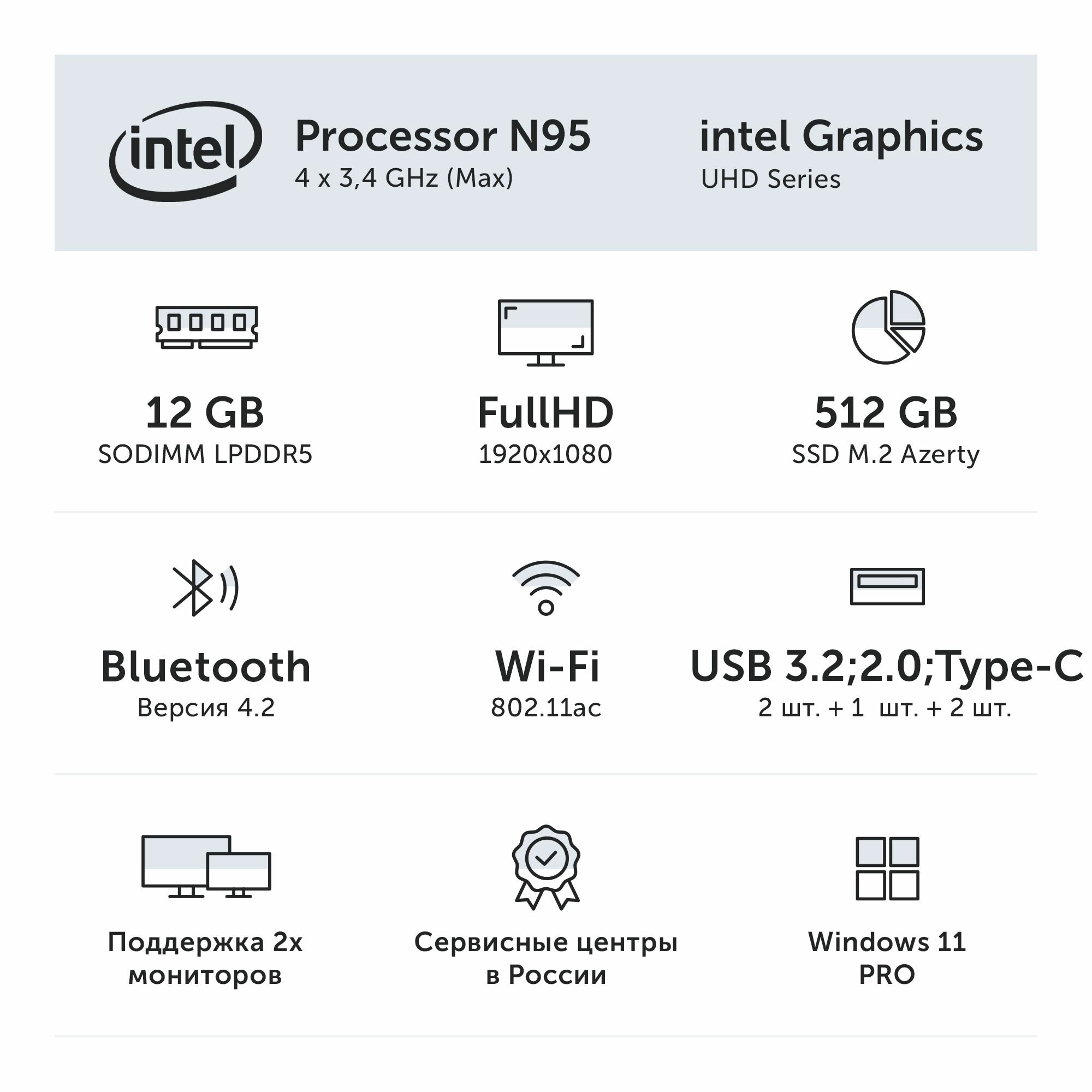 Ноутбук Azerty AZ-1526 (15.6" IPS 1920x1080, Intel N95 4x1.7Ghz, 12Gb LPDDR5, 256Gb SSD)
