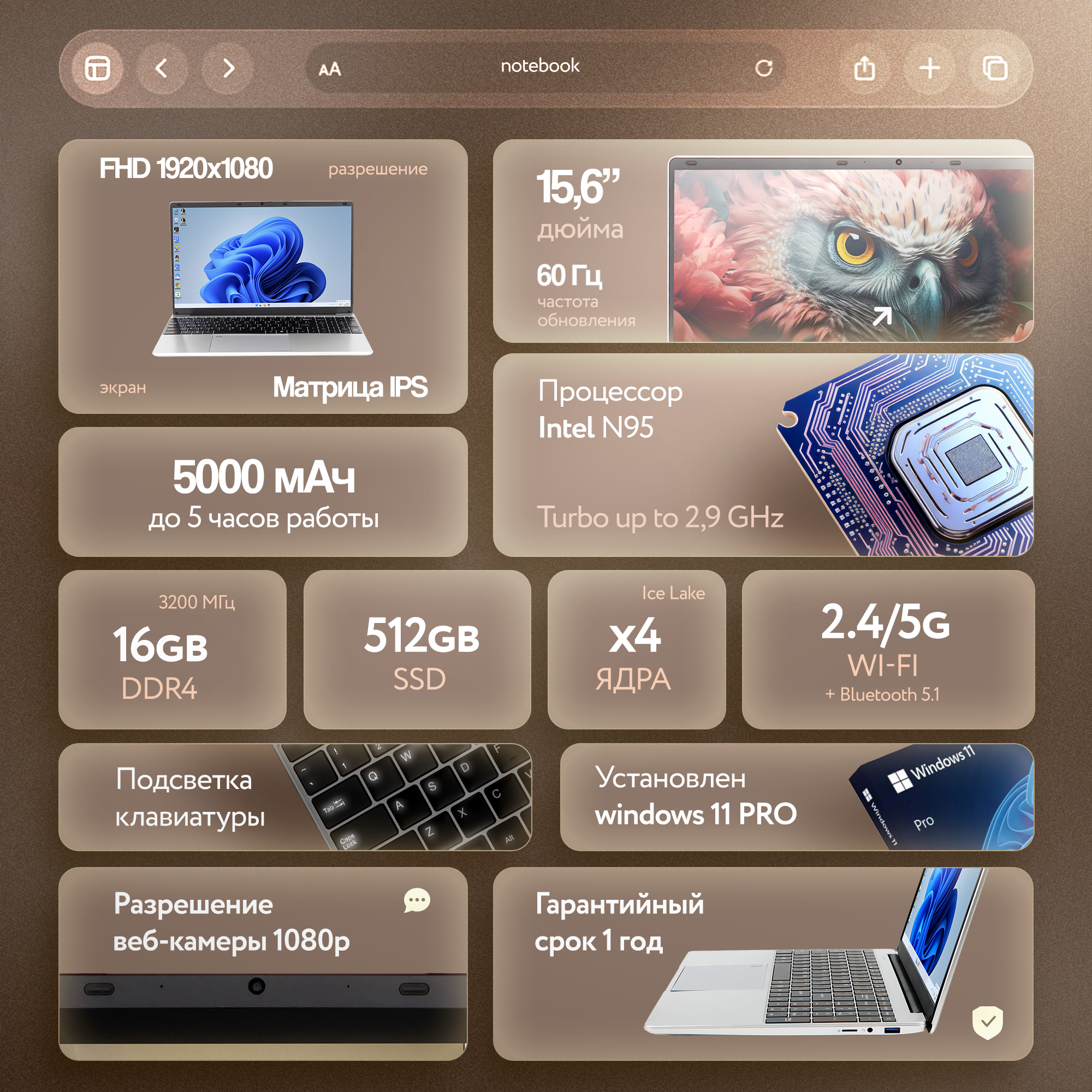 Сохранить15,6" Ноутбук для работы и учебы, RAM 16 ГБ, SSD 512ГБ, IPS Full HD 1920x1080, Intel N95, Windows 11, Серый интересное: