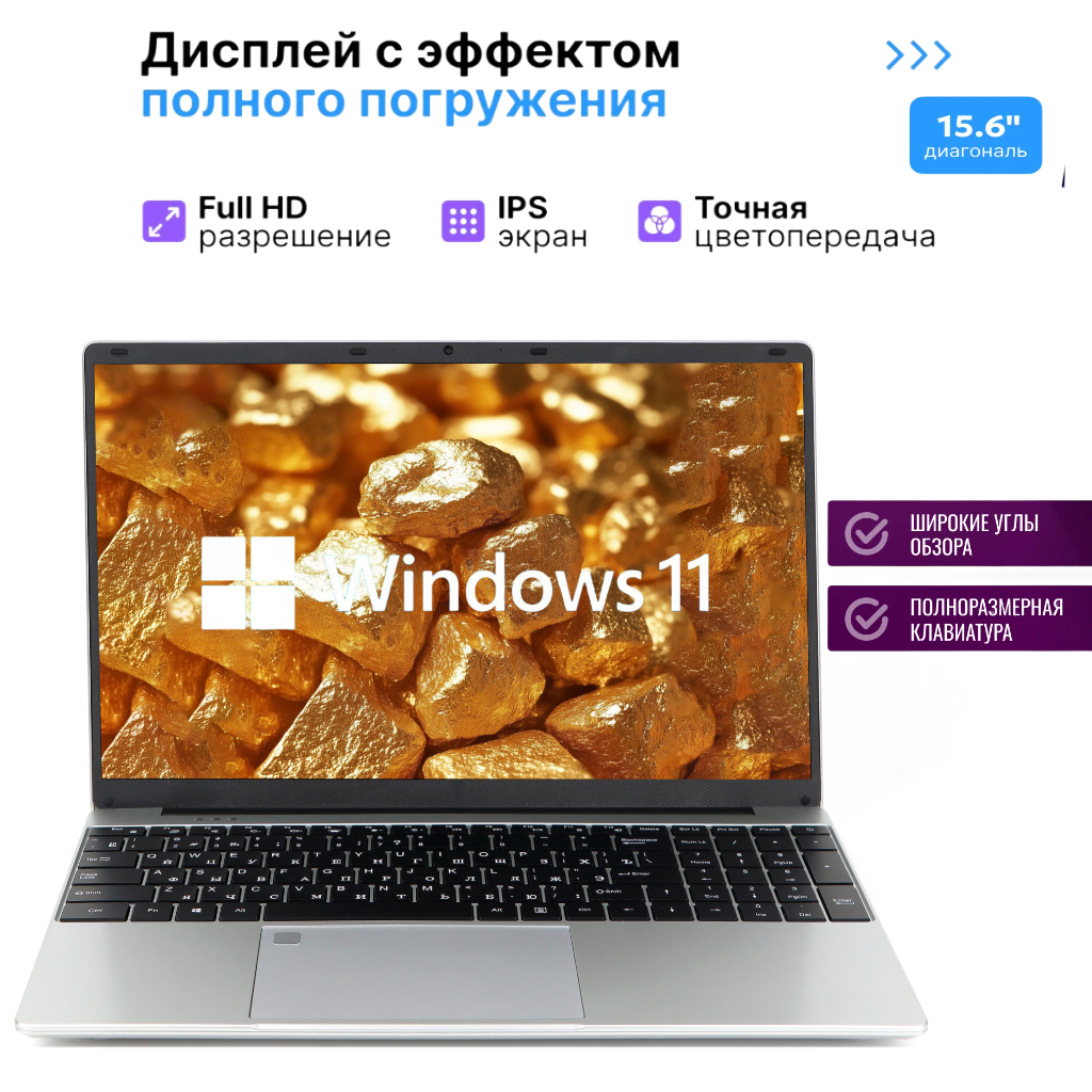 Ноутбук 15,6" с процессором Intel Celeron5095, 16 Гб ОЗУ, 512 Гб SSD, Windows 11 Серебро