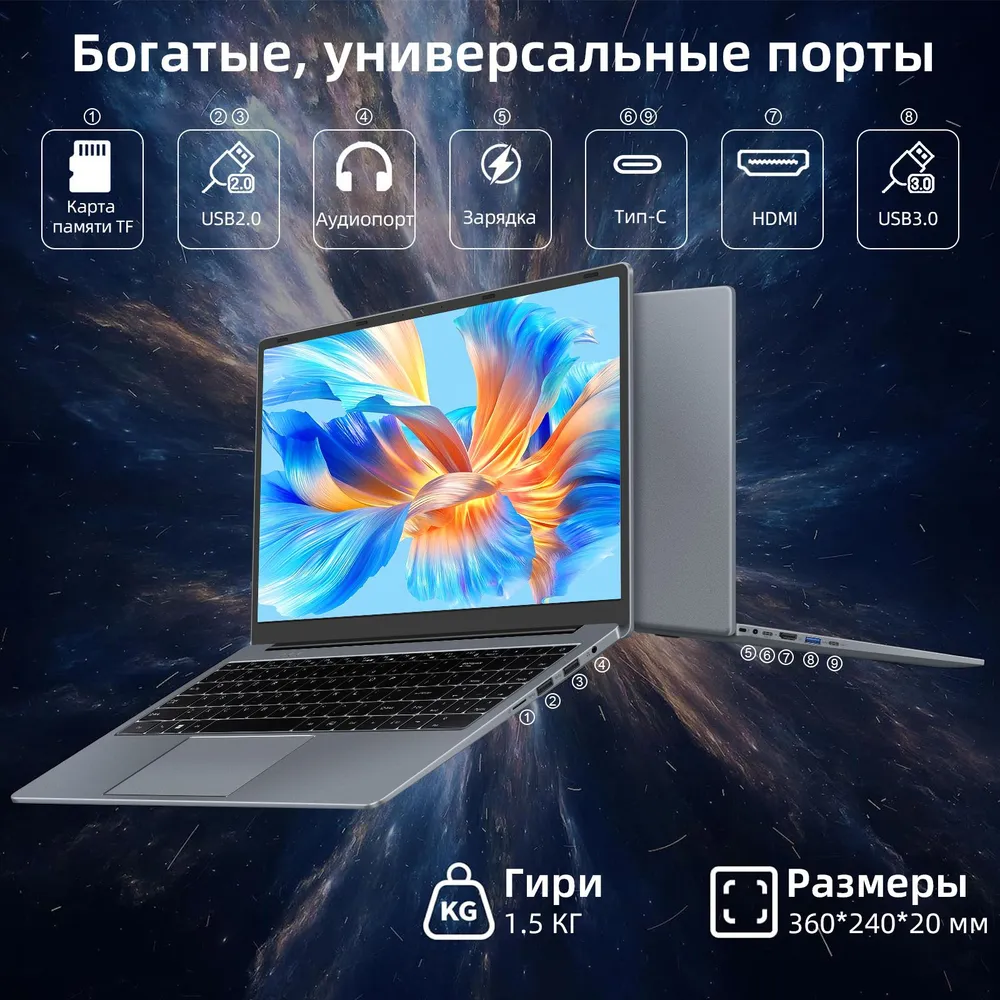 Ноутбук, 15,6", IPS, Windows 11, Intel N95, 16GB, SSD 512GB, HDD 512GB