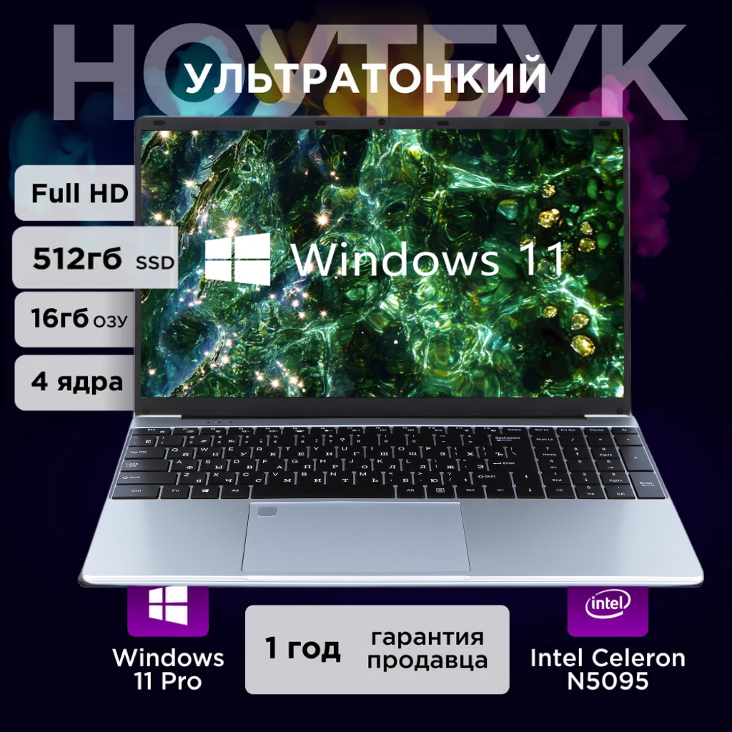 15.6" Ноутбук Intel N5095, для работы и учебы, Notebook, RAM 16 ГБ, SSD 512ГБ, IPS Full HD 1920x1080, Windows 11 pro, Чёрный, русская раскладка