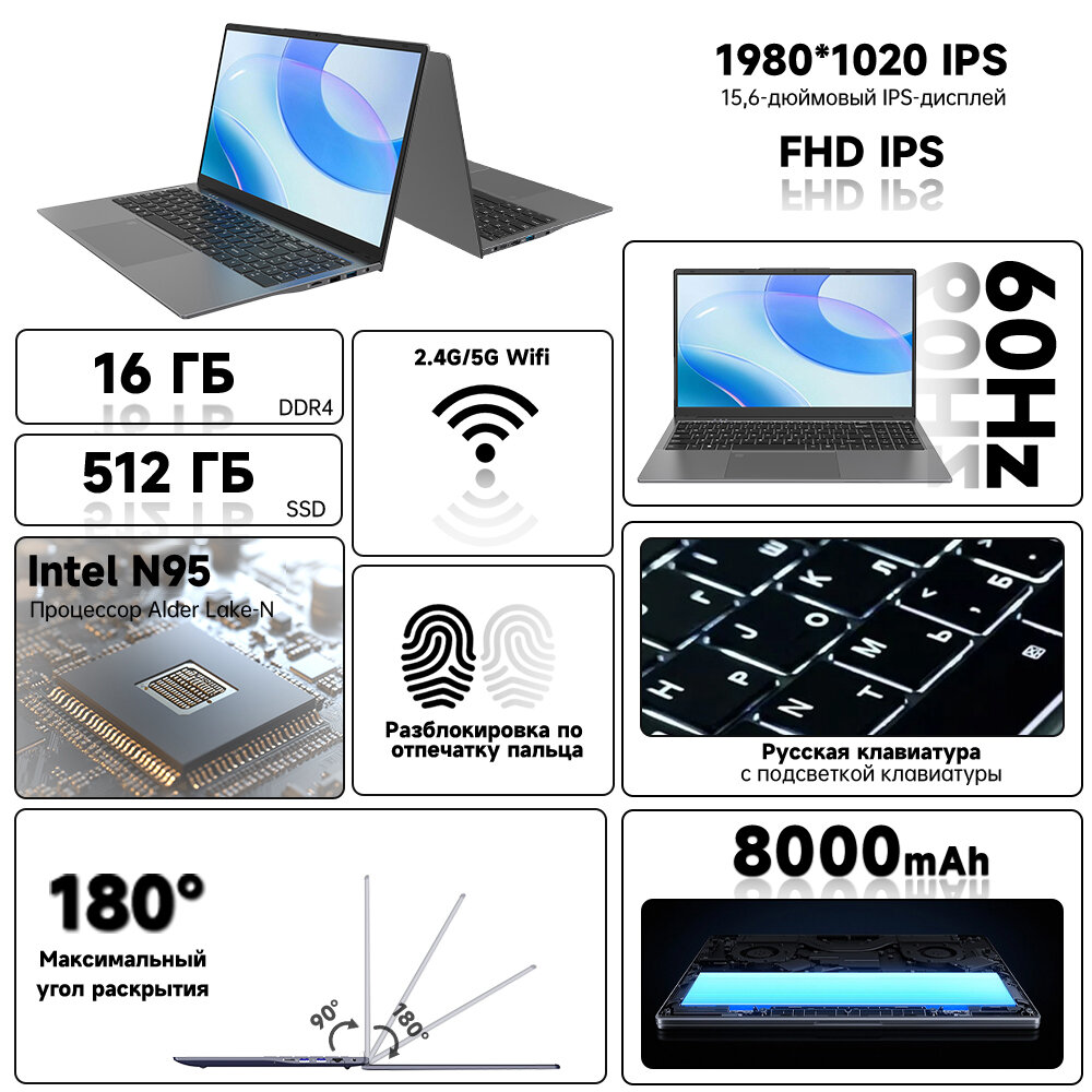 Ноутбук SPETIME AIR2024 15,6-дюймовый Intel N95 (3,4 ГГц) 1920x1080P Full HD 16 ГБ ОЗУ + 512 ГБ SSD интересное: