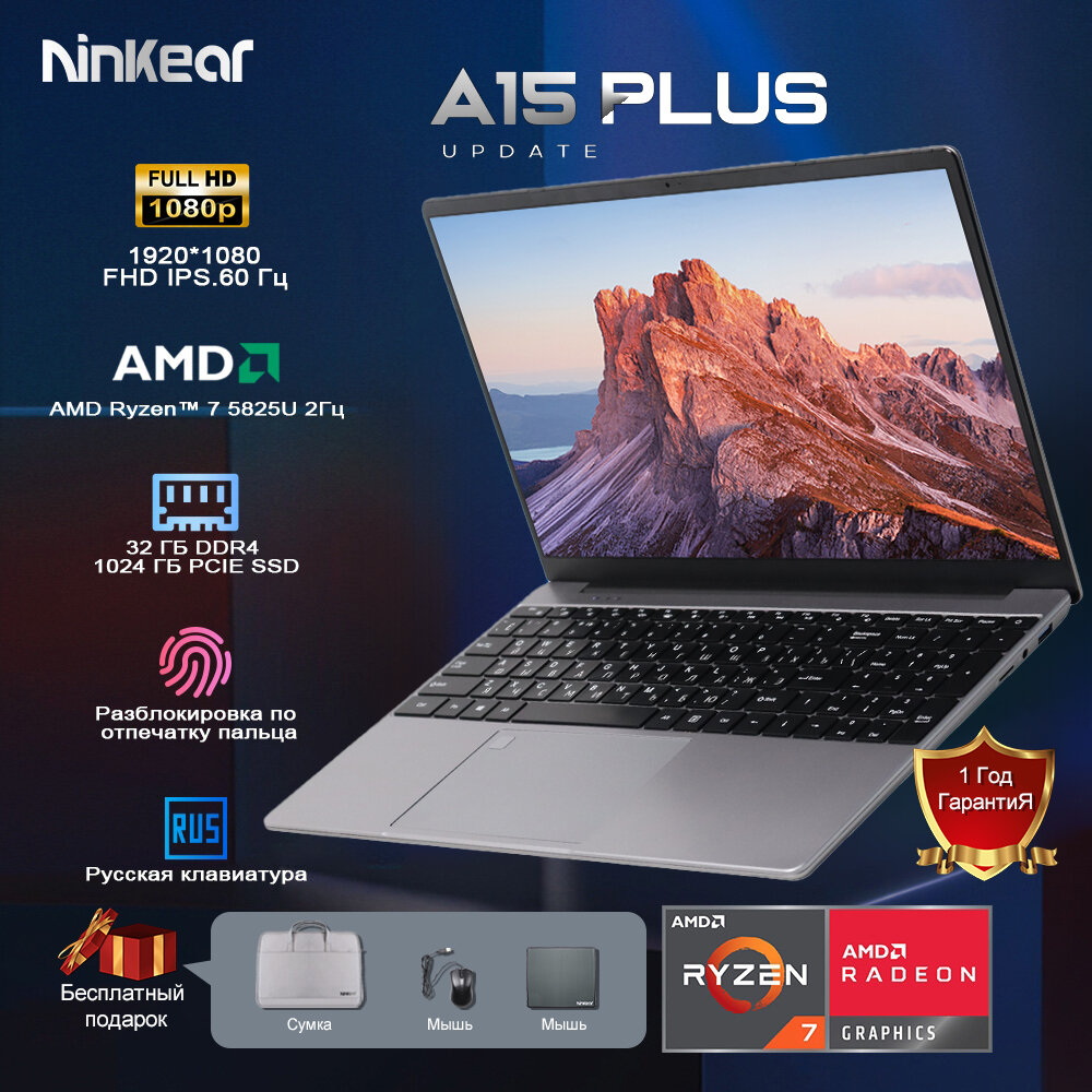 Купить Ninkear A15 Plus Ноутбук 15.6", AMD Ryzen 7 5825U (2.0 ГГц), RAM 32 ГБ, 1ТБ SSD, AMD Radeon Graphics, Windows 11, Cеребристый(Есть сумка)