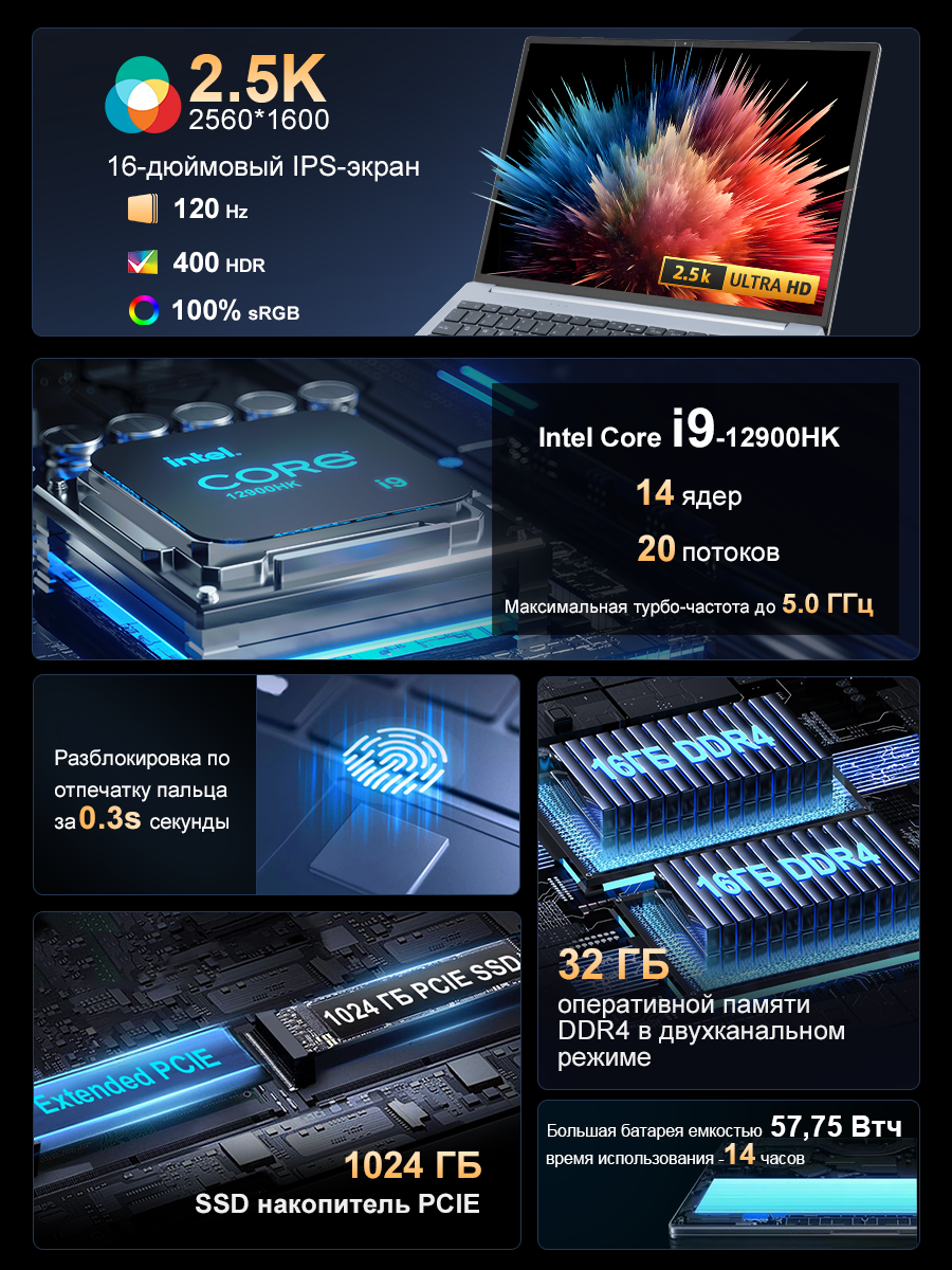 Ноутбук Acoveita N16 Pro 16" 2.5K 120 Гц Intel Core i9-12900HK 32 ГБ DDR4 RAM/1024 ГБ SSD Windows 11 Pro интересное: