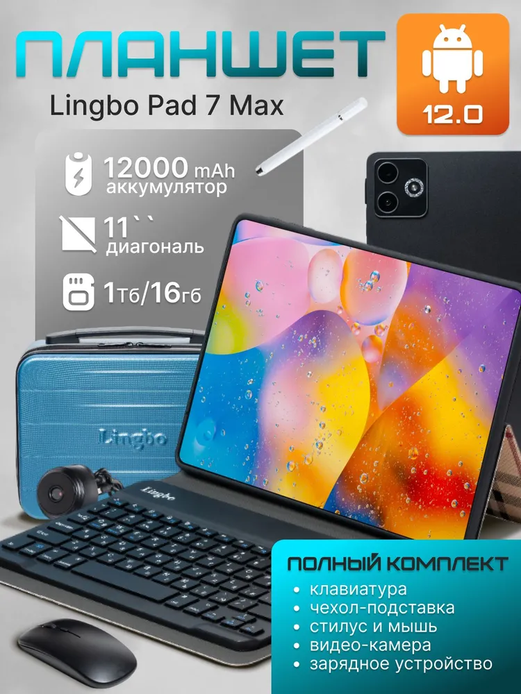 Планшет Pad 7 MAX с клавиатурой, защитным чехлом, стилусом и мышкой, 16Гб/1Тб, андроид 12, экран 10,1"