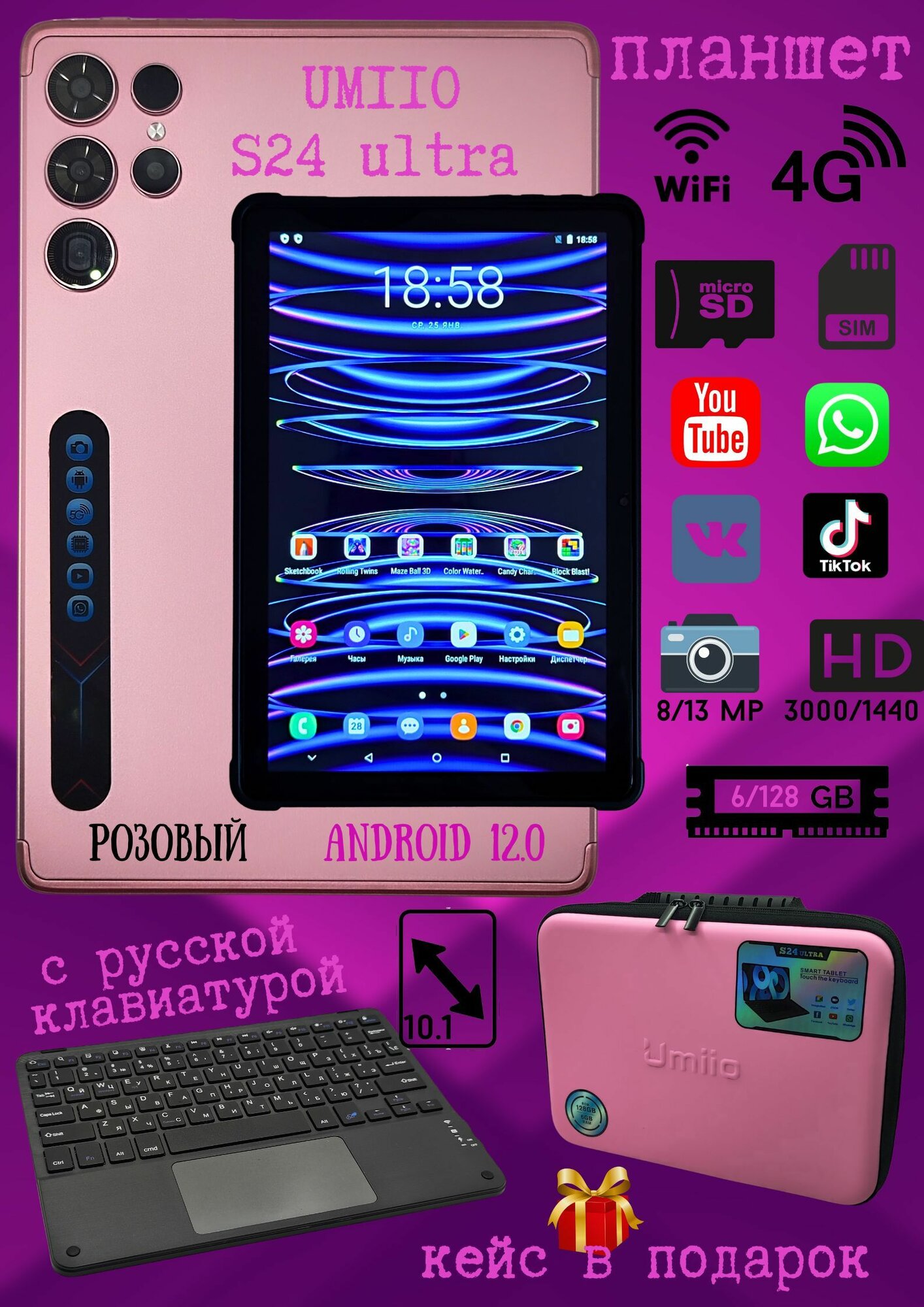 Планшет Андройд UMIIO S24 Ultra, 10,1", Android 12, 6/128, розовый, с клавиатурой и кейсом сумкой интересное: