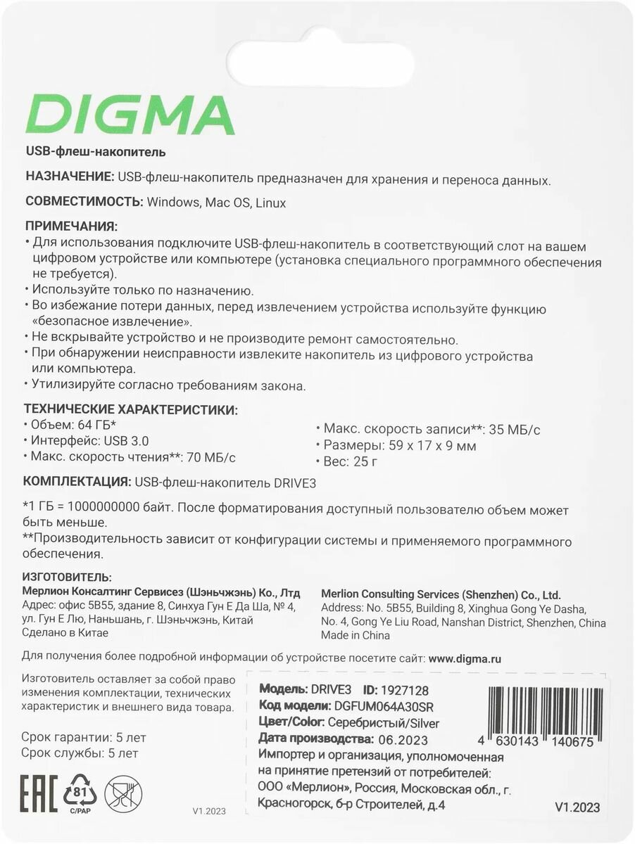 Флешка USB Digma DRIVE3 64ГБ, USB3.0, серебристый [dgfum064a30sr] интересное: