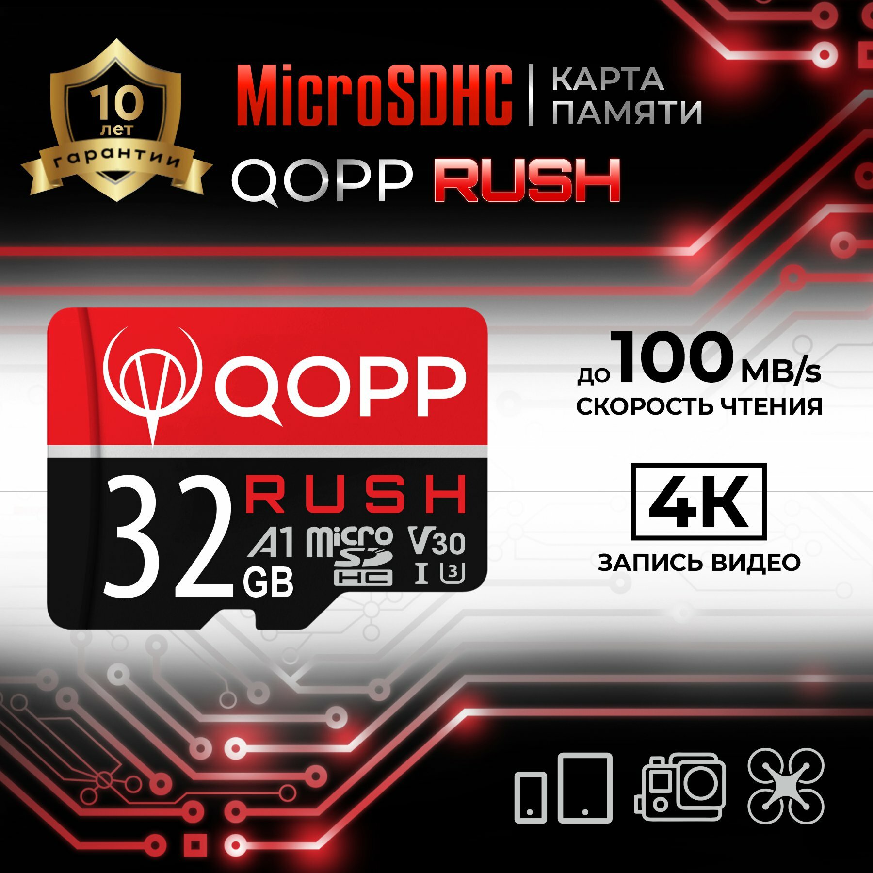 Купить Карта памяти 32 Гб QOPP "RUSH" А1 U3 V30 micro SD высокоскоростная
