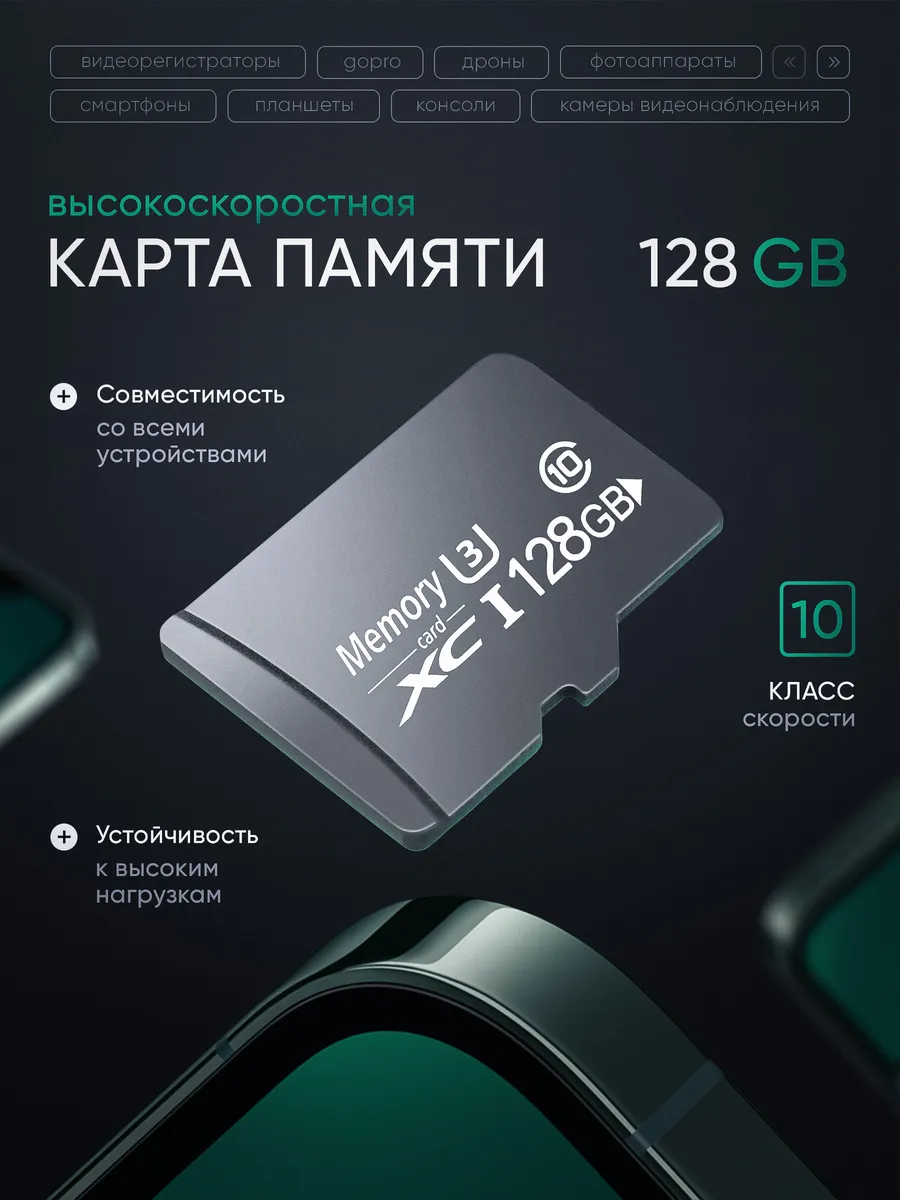 Купить Флешка 128 гб микро microSD для видеорегистратора и телефона+Подходящий адаптер