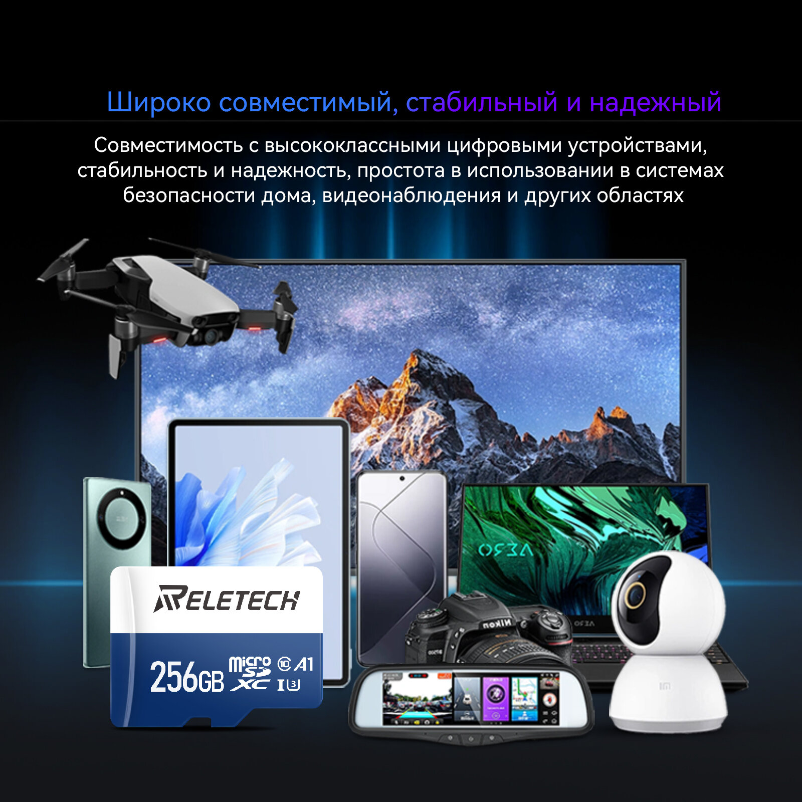 СохранитьКарта памяти Reletech micro SD A1 256ГБ Для Цифровая камера, камера наблюдения, дрон, регистратор вождения, синий и белый интересное: