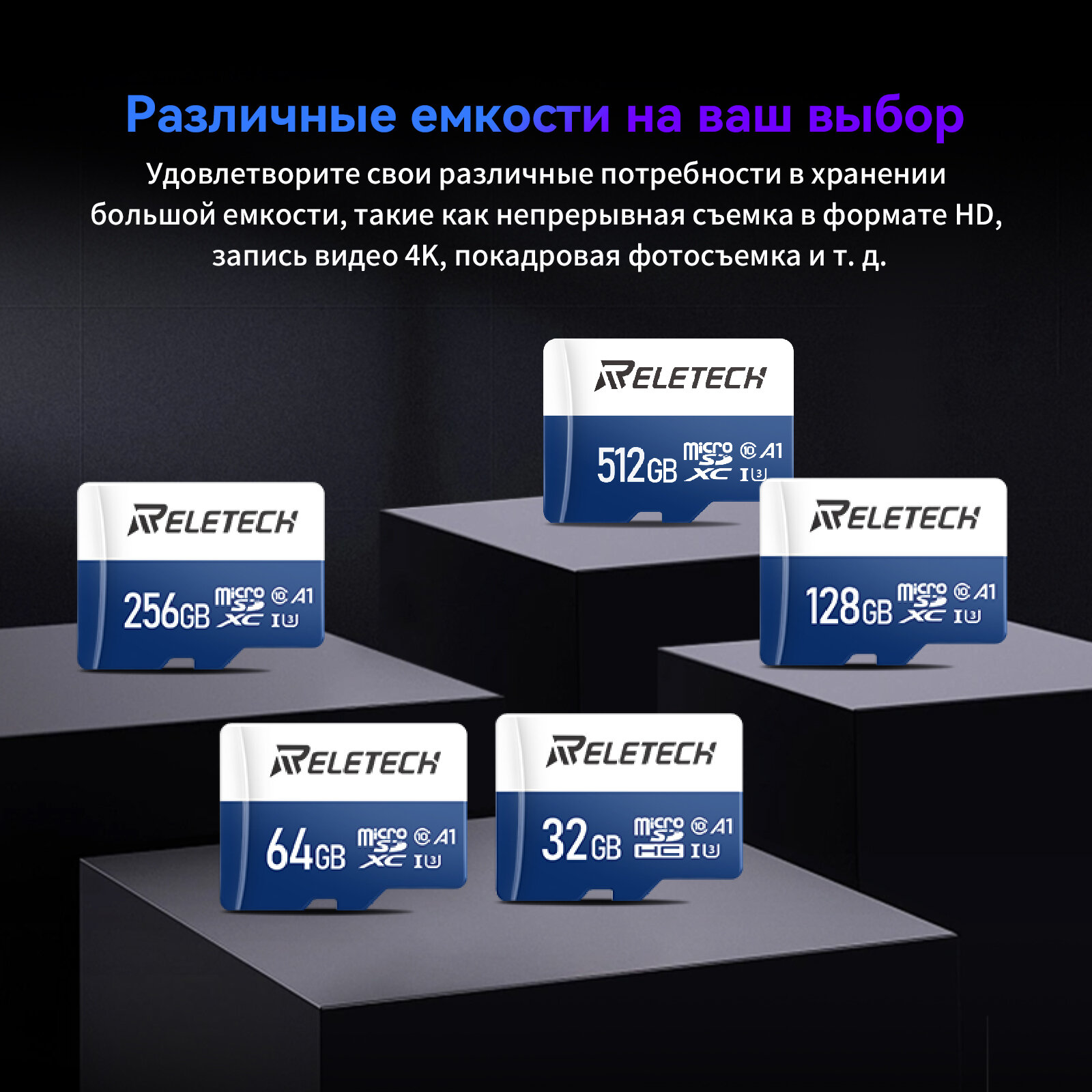 Карта памяти Reletech micro SD A1 512 ГБ Для Цифровая камера, камера наблюдения, дрон, регистратор вождения, синий и белый