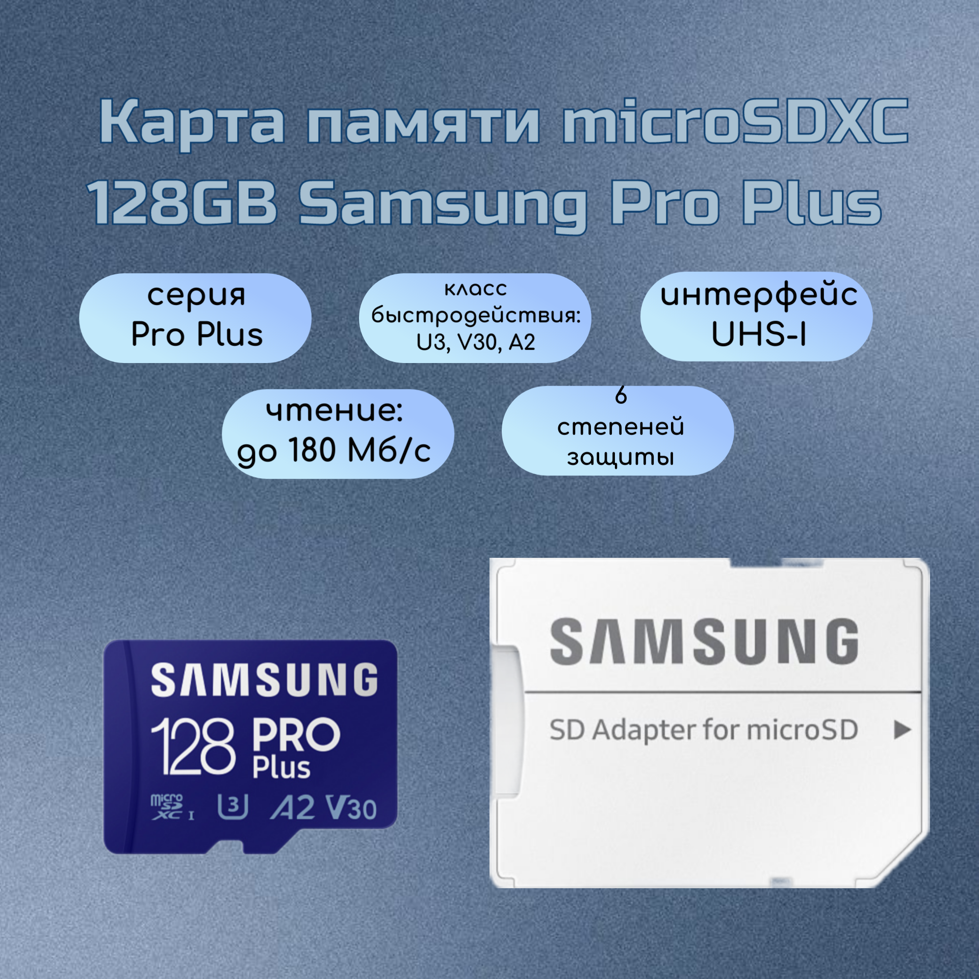 Ниже Вы можете прочитать отзывы на Карта памяти Samsung Pro Plus microSDXC 128GB Class 10, V30, A2, UHS-I U3, R 180 МБ/с, адаптер на SD, ознакомится с подробными характеристиками, посмотреть интересные обзоры и фотографии на Карта памяти Samsung Pro Plus microSDXC 128GB Class 10, V30, A2, UHS-I U3, R 180 МБ/с, адаптер на SD.