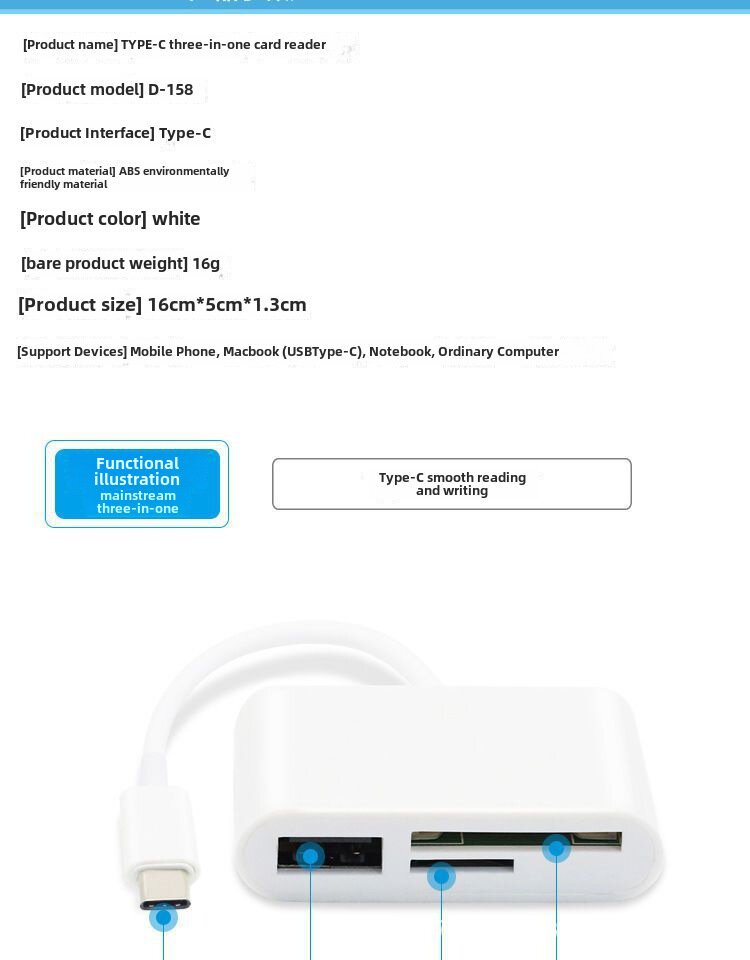 Кард-ридер Liangke "три в одном", с кабелем, для Android, пластик, белый интересное: