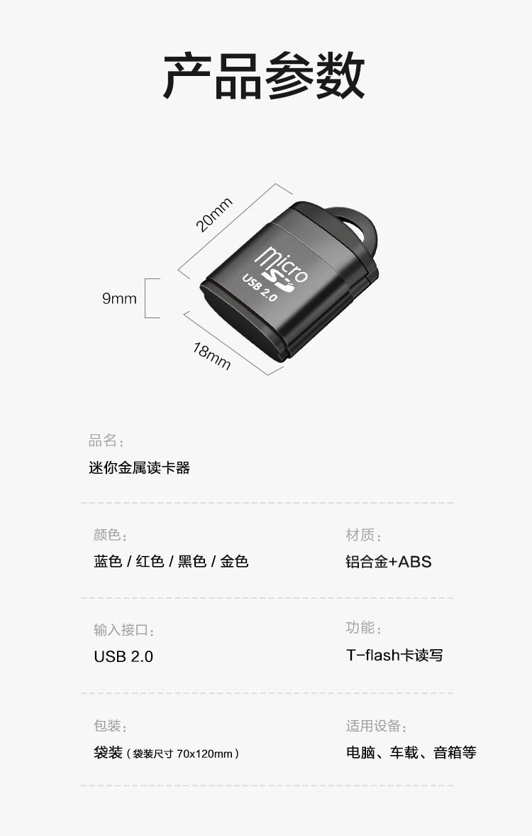 Устройство чтения карт памяти, алюминиевый корпус, с цепочкой, USB2.0, T-Flash, черный