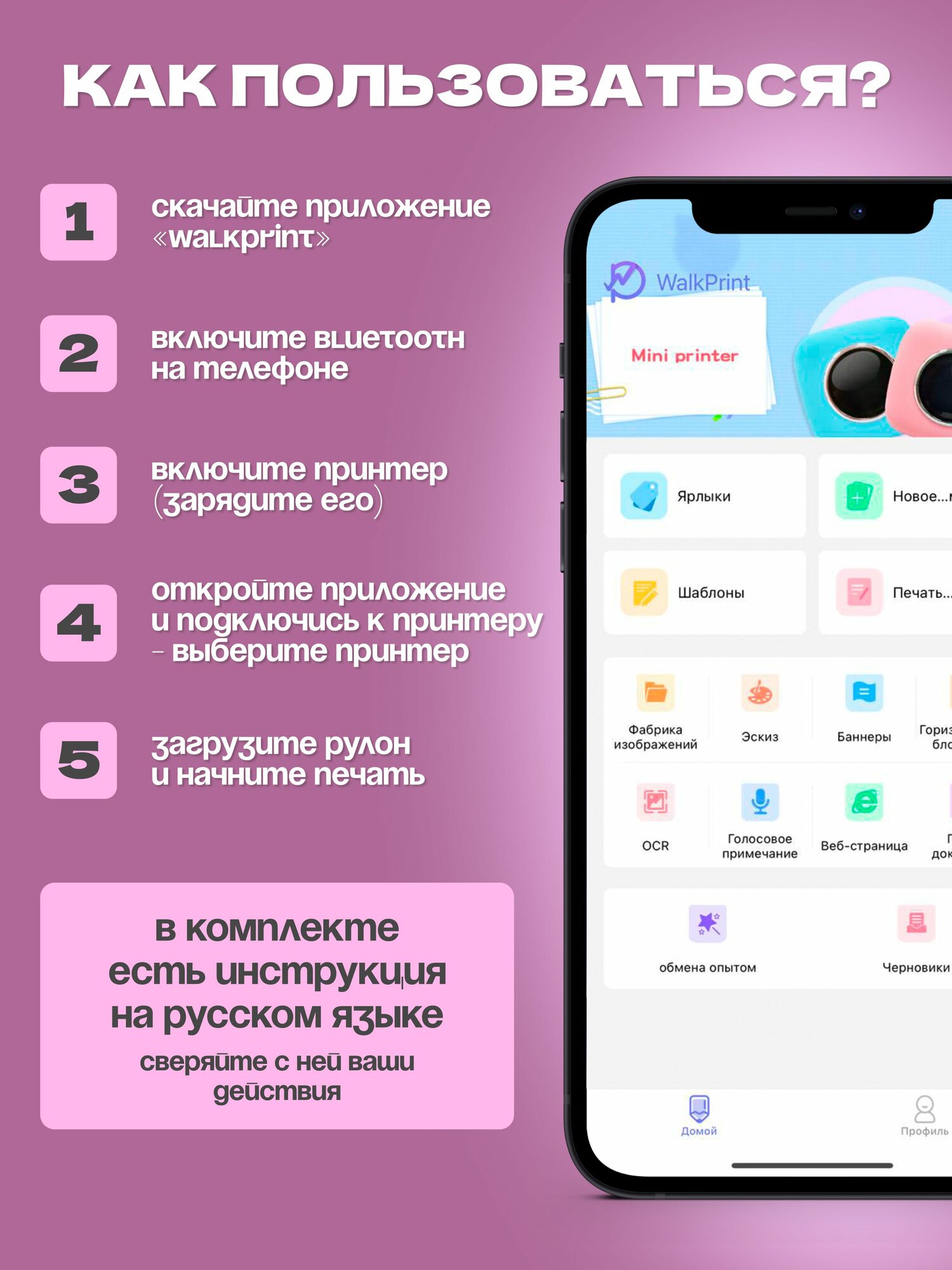 Мини принтер; термопринтер; портативный принтер X6 Pro Розовый. Большой набор.