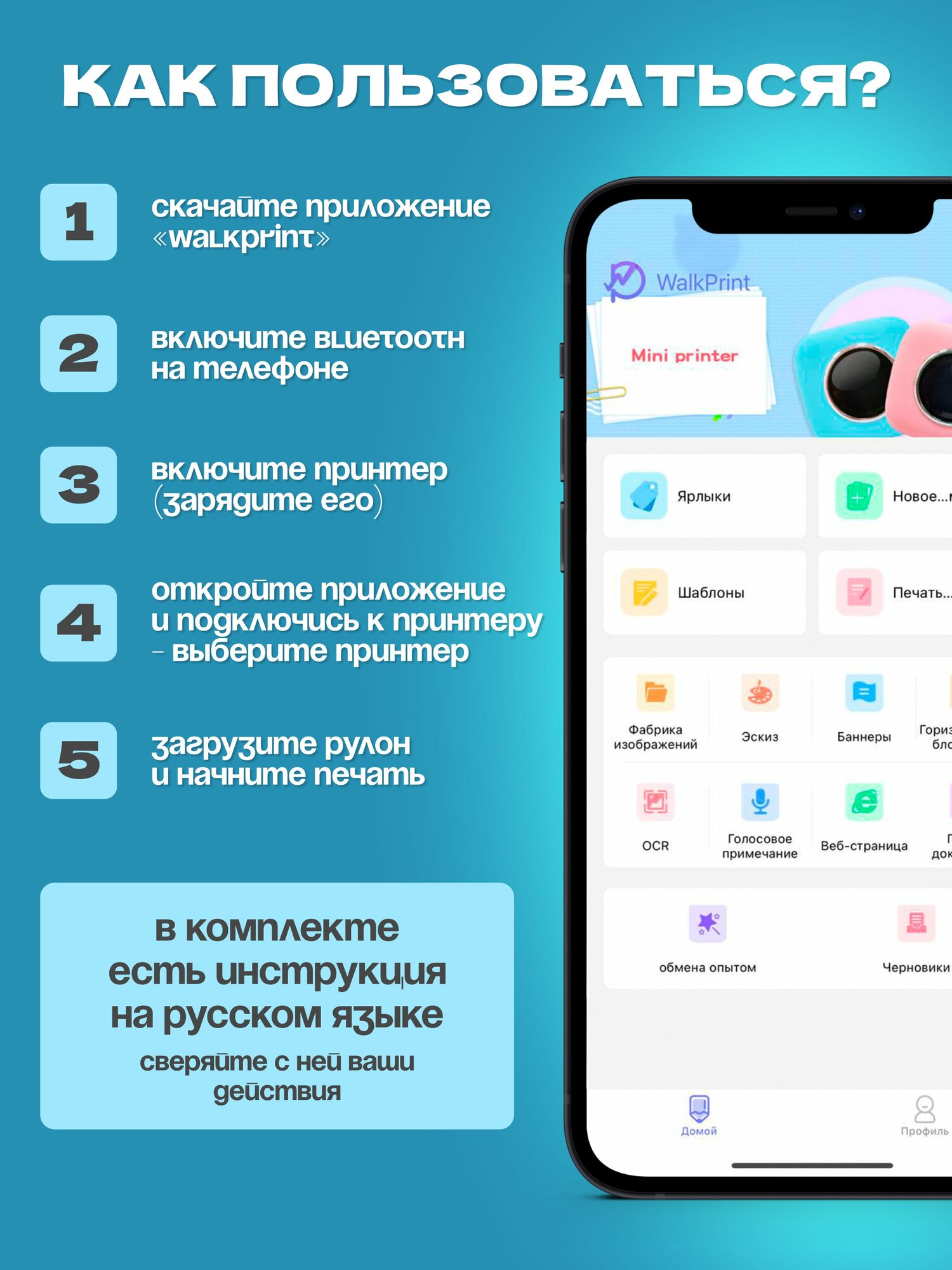 Мини принтер; термопринтер; портативный принтер X2 Blue. Большой набор.