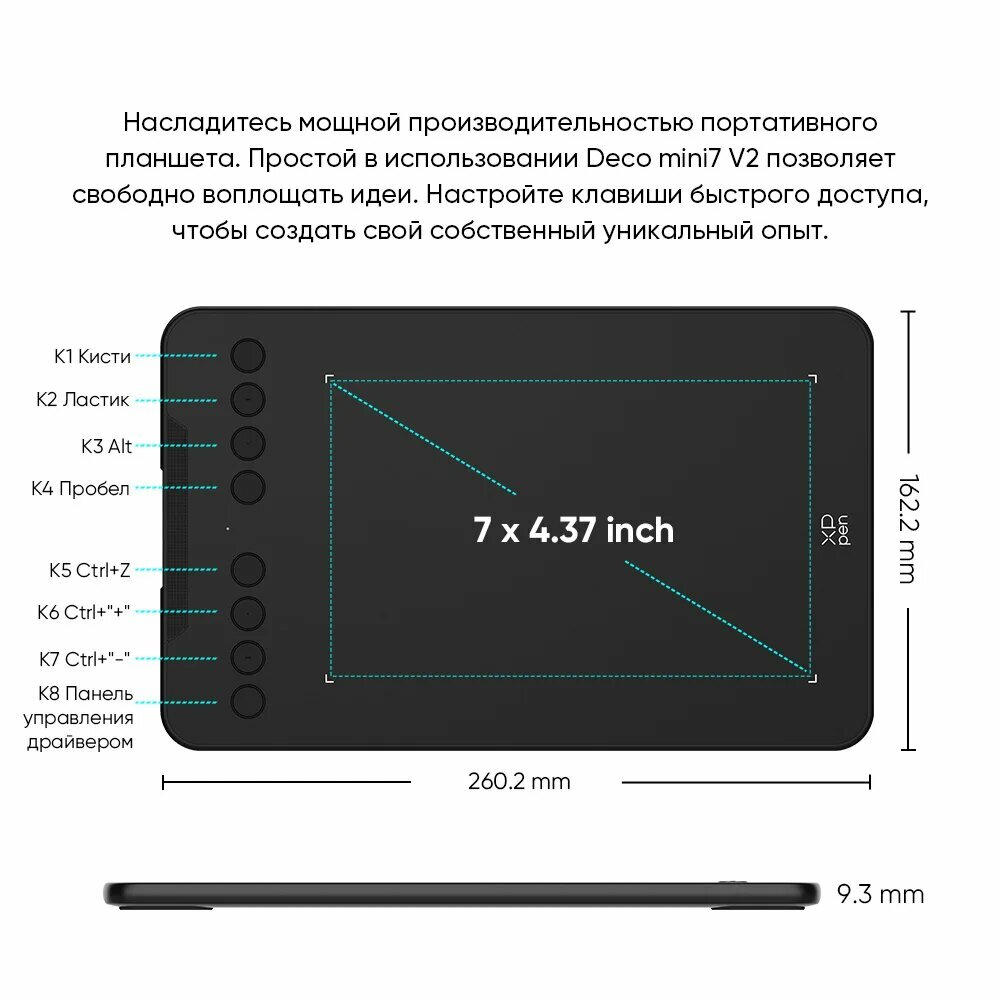 Планшет графический XPPen, рабочая область 7.03*4.37 дюймов, 5080 LPI, черный, Deco Mini7 V2