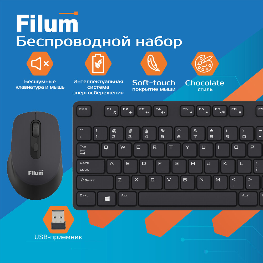 Комплект клавиатура и мышь Filum Wireless FL-KTW15-BK, беспроводная, русская раскладка, мембранная, черный интересное: