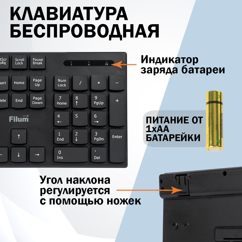 Комплект клавиатура и мышь Filum Wireless FL-KTW10-BK, беспроводная, русская раскладка, мембранная, чёрный интересное: