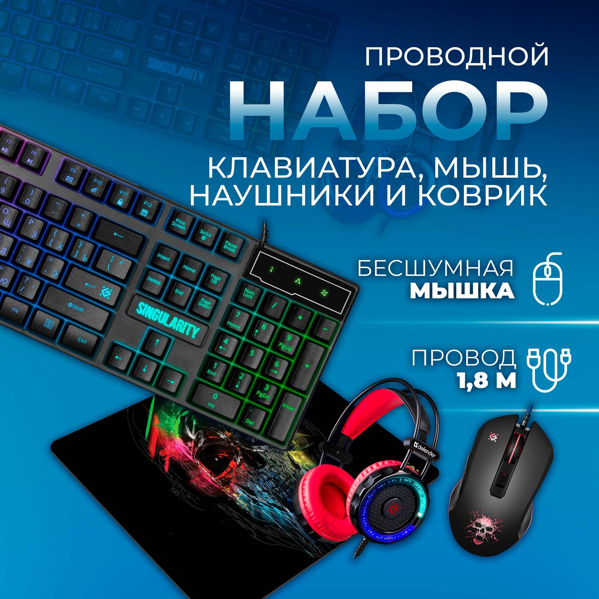 Игровой набор Singularity MKP-118, мышь для пк, компьютерная клавиатура, наушники игровые, коврик, DEFENDER интересное: