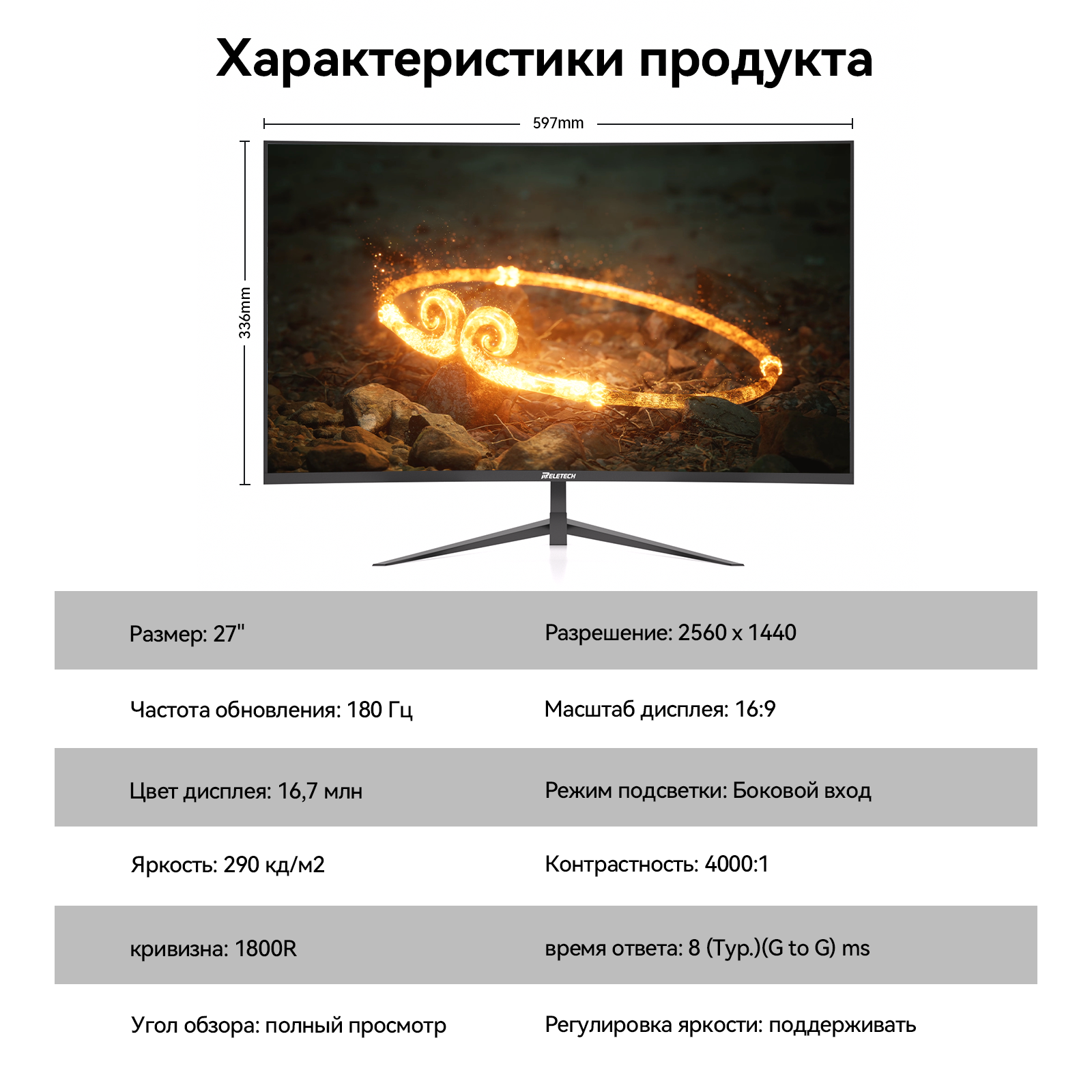Монитор Reletech G27X Flex Pro, 27 ", игровой, изогнутый, 2560x1440 QHD, 180 Гц, HDMI x2, DP x2, 1800R, 72% sRGB, Адаптивная синхронизация интересное: