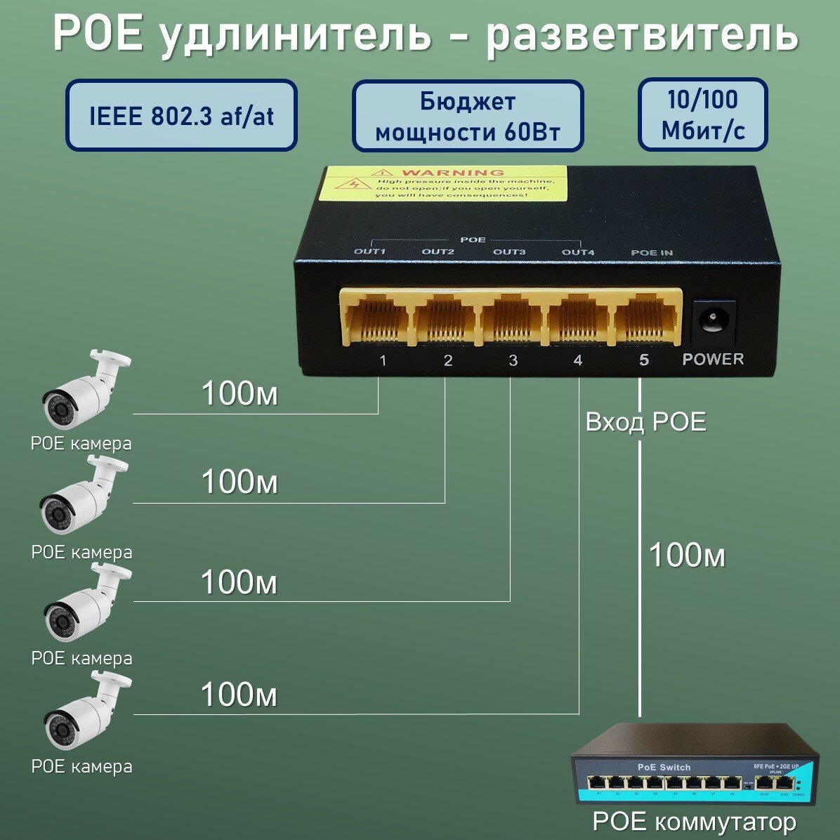 YDA PoE-инжектор удлинитель - разветвитель, работает от POE, 1 POE вход - 4 POE выхода, бюджет мощности 60 Вт интересное: