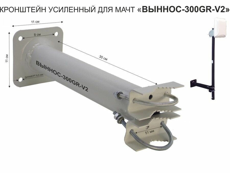 Кронштейн усиленный для мачт "ВЫННОС-300GR-V2" серый с 2-м хомутом и 1отв.25мм для гофры, 0,3м, 51мм интересное:
