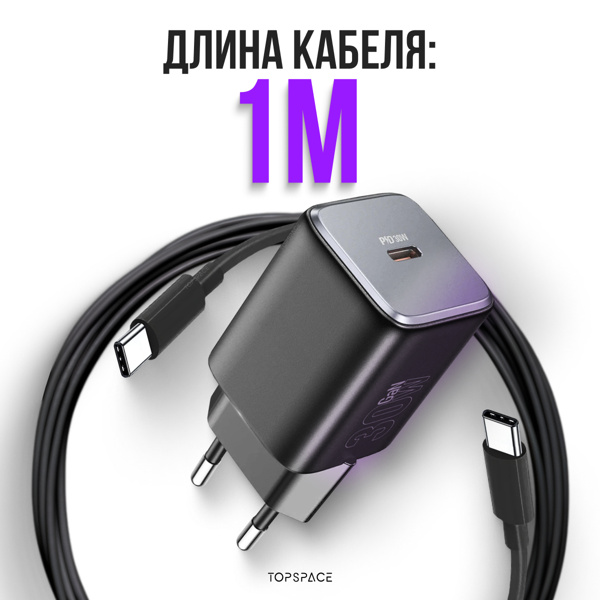 Зарядка белая с кабелем для Умной колонки Алиса Станция Мини 3 (блок 30W + шнур Type-C / Type-C до 60W 1 метр)