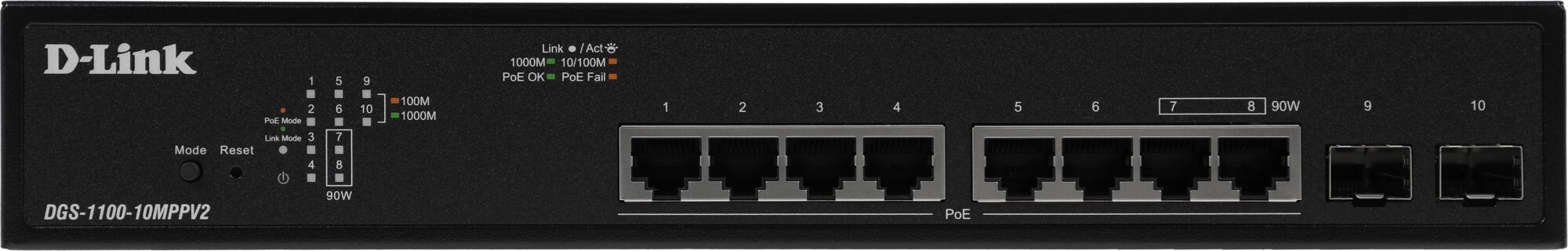 Купить Коммутатор D-Link DGS-1100-10MPPV2/A (L2) 8x1Гбит/с 2SFP 8PoE+ 242W настраиваемый