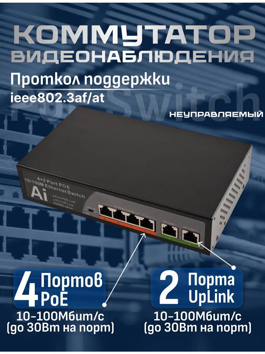 Коммутатор видеонаблюдения неуправляемый (свитч) 4 PoE+2 Uplink, черный интересное: