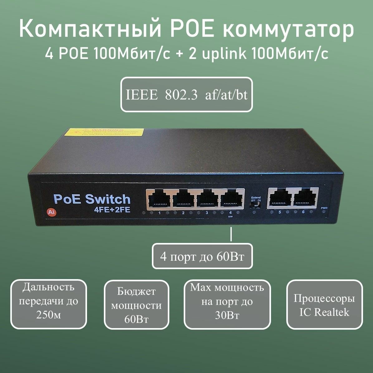 YDA Коммутатор POE свитч с 4POE +2Uplinк 100 Мбит/с , дальность до 250 метров, бюджет 60 Ватт, черный матовый интересное: