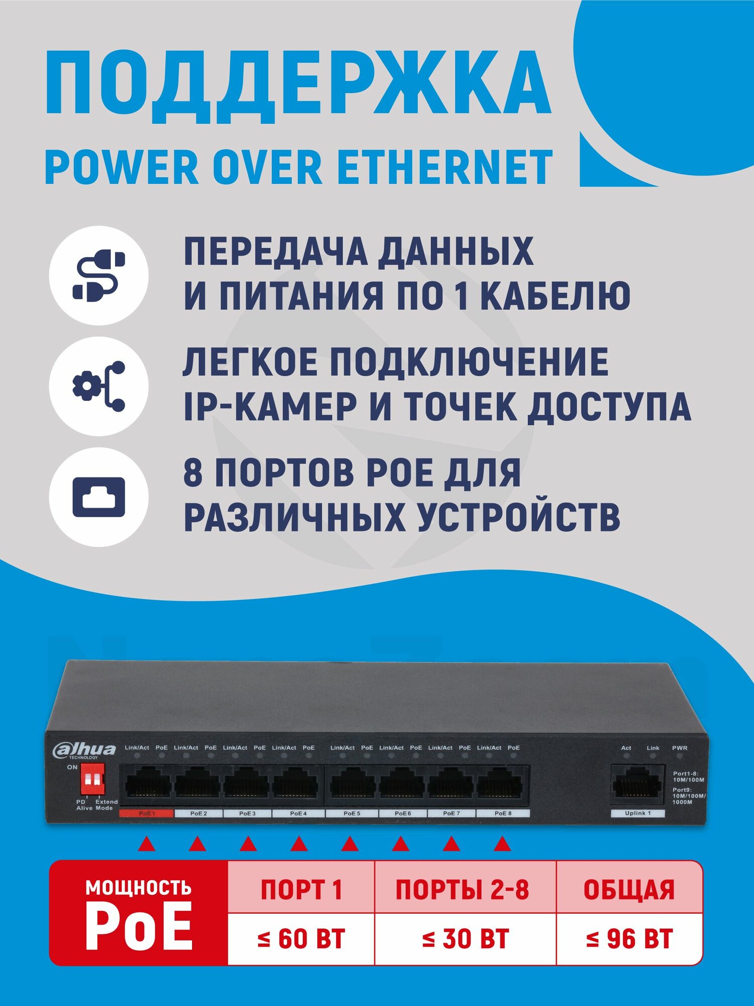 Dahua DH-PFS3009-8ET1GT-96 - коммутатор сетевой 8 портовый неуправляемый с РоЕ интересное: