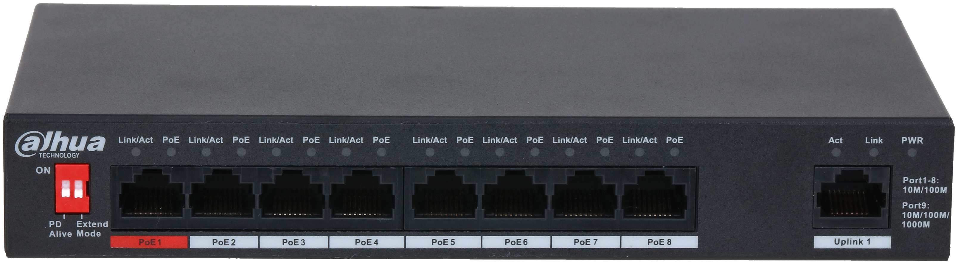 Купить Коммутатор Dahua DH-PFS3009-8ET1GT-96, неуправляемый, настольный, матрица 3.6 Гбит/с, 8x100Mbit, 1xGbit, 8хPoE, 96 Вт