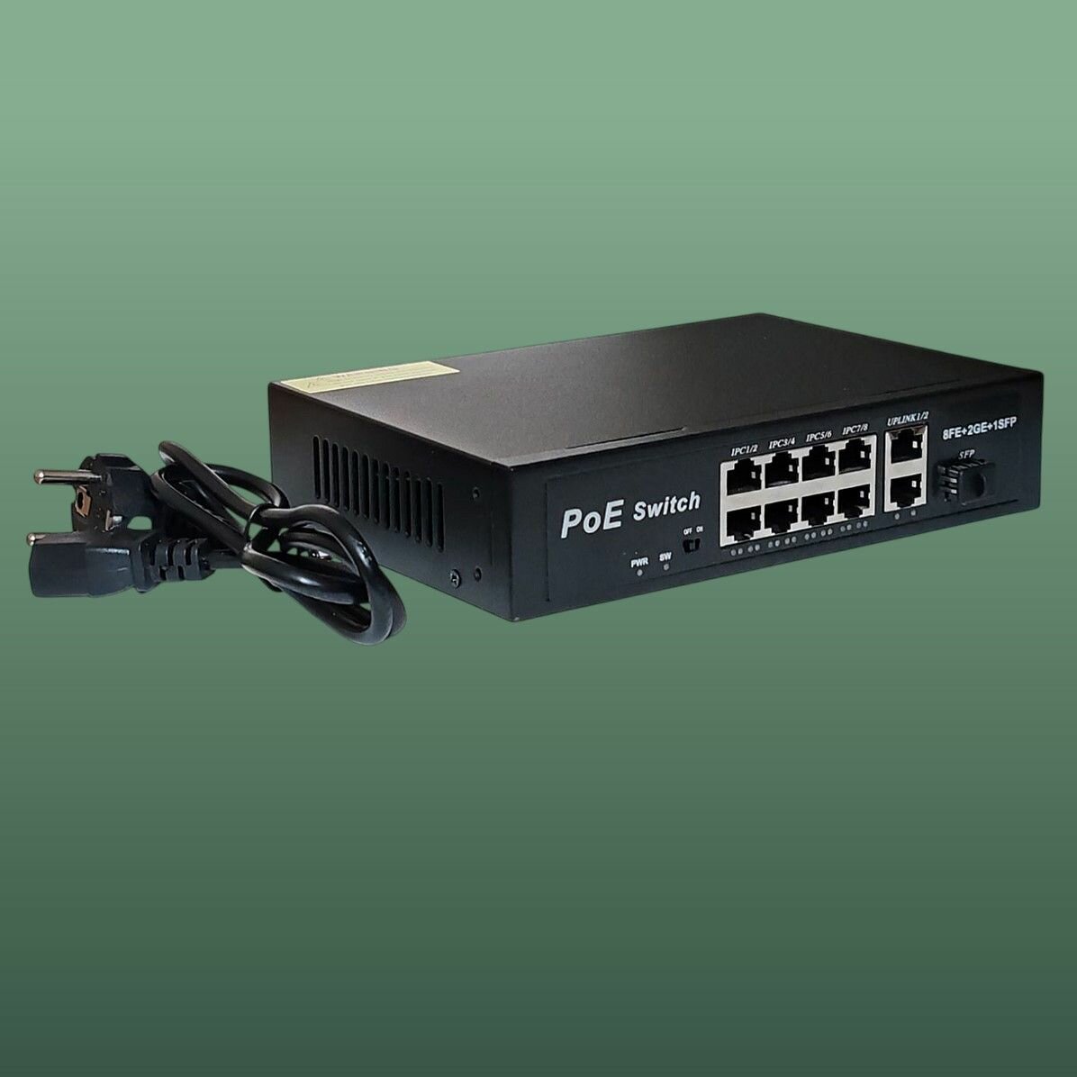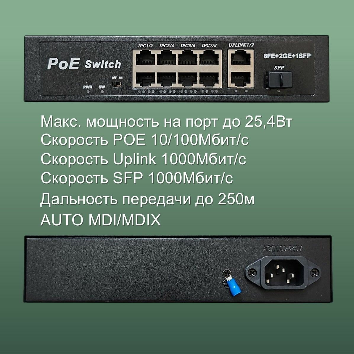 POE коммутатор свитч с 8POE 100 Мбит/с+2Uplinк 1000 Мбит/с+1SFP портов, дальность до 250 метров, бюджет 120 Ватт, грозозащита 6 kV интересное: