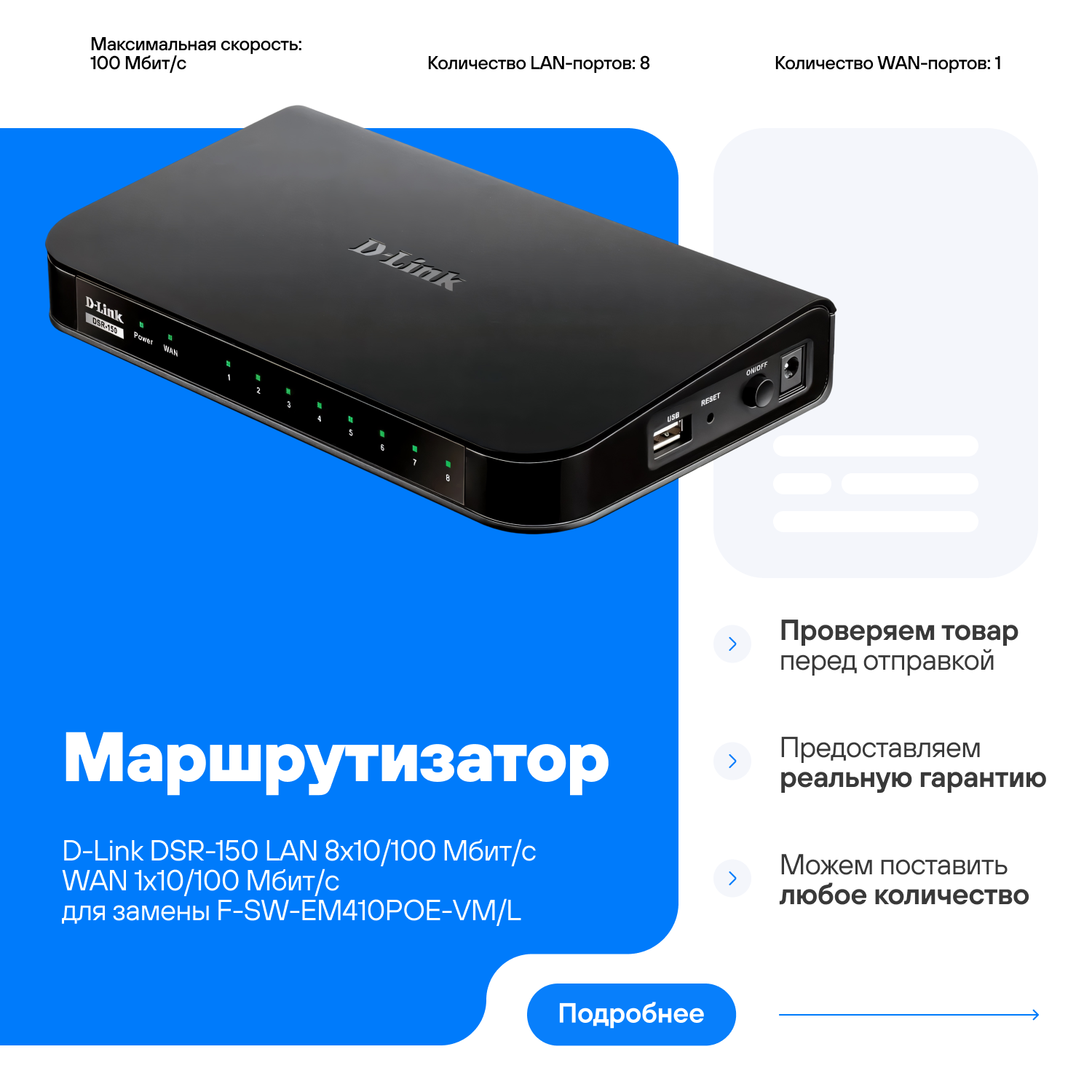 Маршрутизатор D-Link DSR-150 LAN 8x10/100 Мбит/с WAN 1x10/100 Мбит/с интересное: