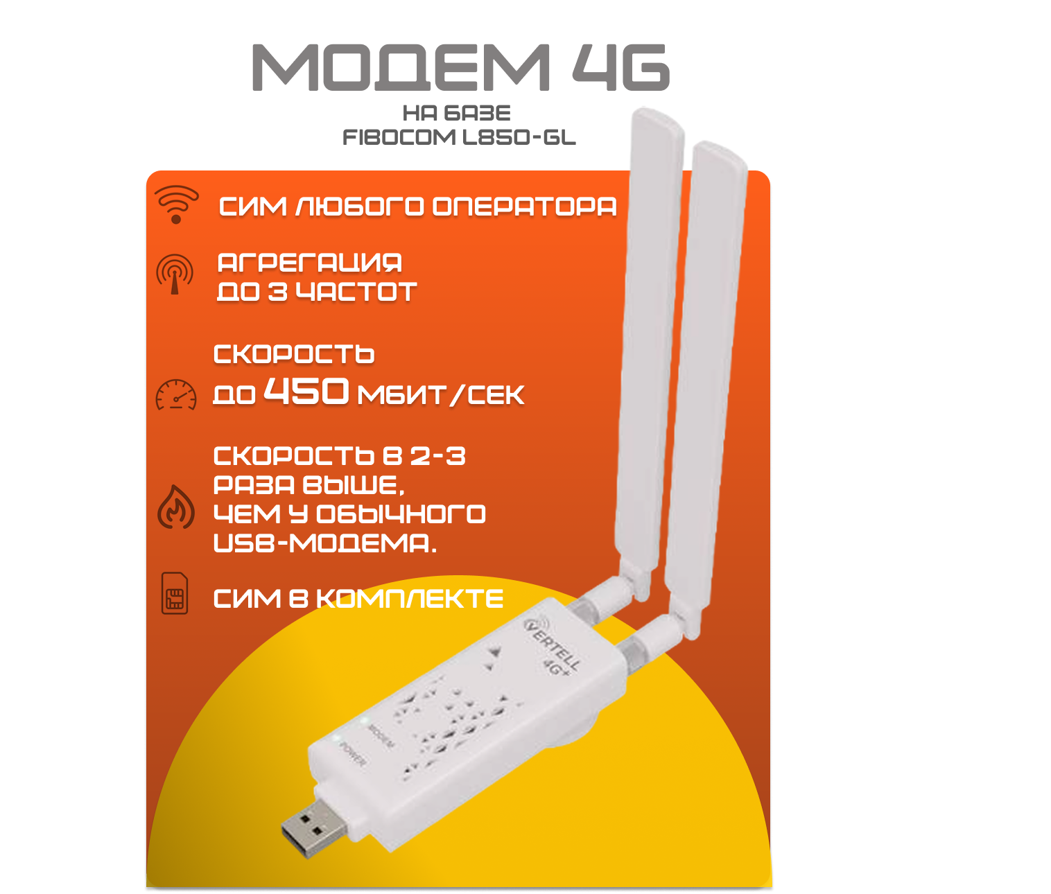 Купить Модем 4G+ LTE Fibocom L850 cat.9 в корпусе VERTELL LONG USB-M.2+Sim-карта в подарок