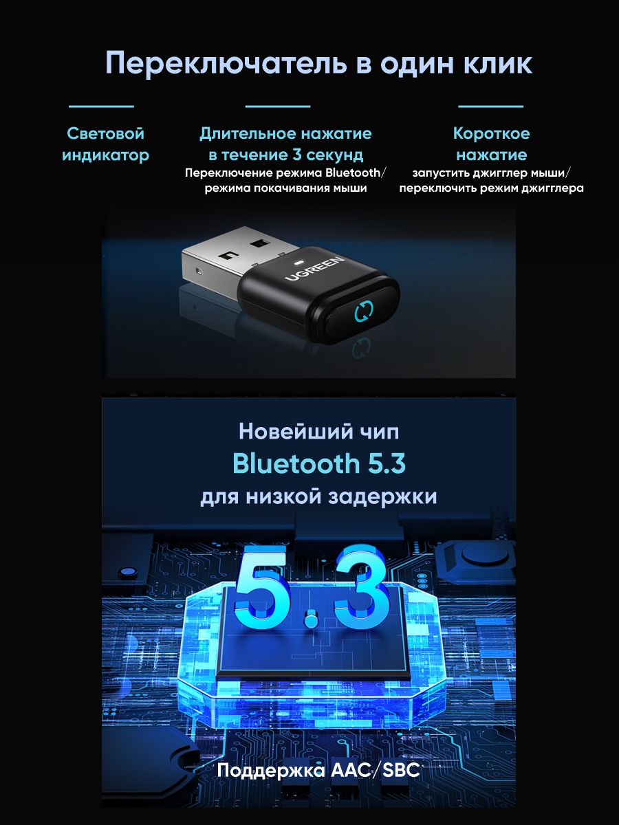 Bluetooth адаптер с эмулятором движения мышки UGREEN BT301 (35994) USB-A Bluetooth 5.4. Цвет: серый интересное: