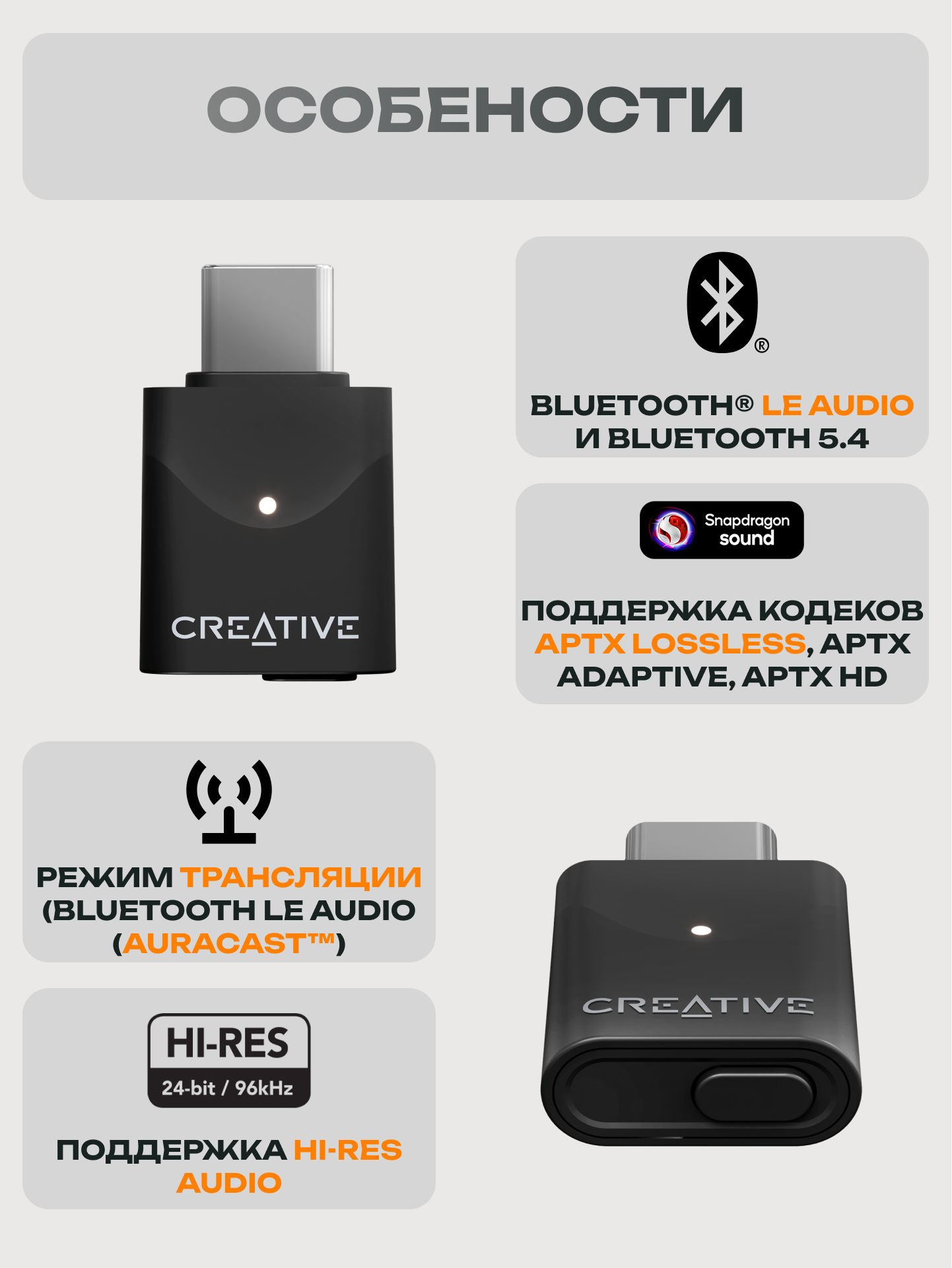 Адаптер Bluetooth Creative BT-W6 , LC3+, Snapdragon Sound, LE Audio, 5.4, aptX LL, aptX Adaptive интересное: