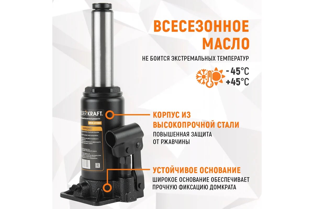 Ниже Вы можете прочитать отзывы на Домкрат автомобильный Бутылочный Гидравлический 8т высота 230мм ход штока 147мм WIEDERKRAFT WDK-81080, ознакомится с подробными характеристиками, посмотреть интересные обзоры и фотографии на Домкрат автомобильный Бутылочный Гидравлический 8т высота 230мм ход штока 147мм WIEDERKRAFT WDK-81080.