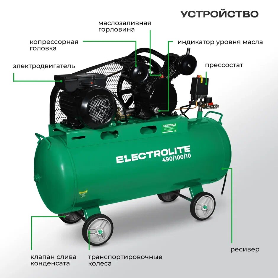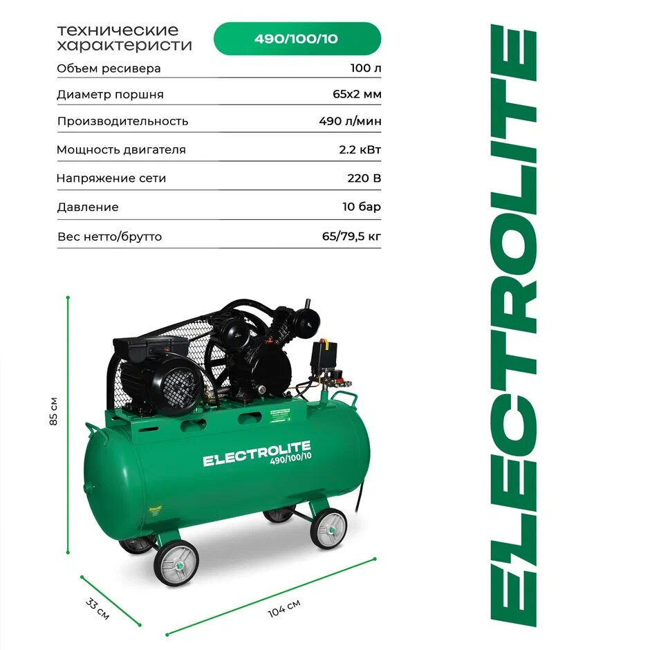 Компрессор воздушный поршневой ELECTROLITE 490/100 ( 2,2 кВт, 490л производительность, 100л ресивер ) интересное:
